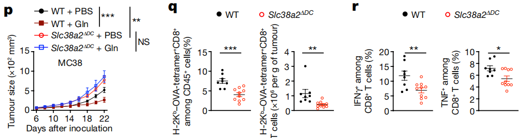 而且,对于缺乏cDC1s的结直肠癌或黑色素瘤小鼠来说,补充谷氨酰胺无法再显著抑制肿瘤生长。