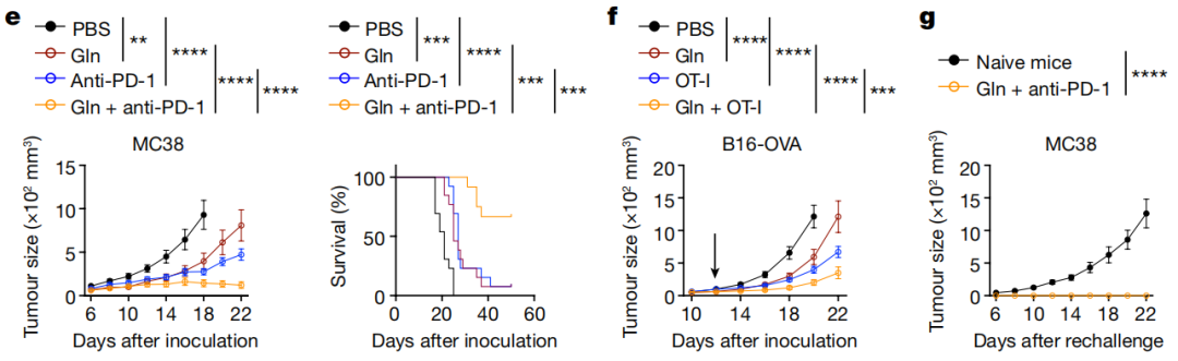 通过每日直接注射来补充小鼠肿瘤内的谷氨酰胺水平后观察到,小鼠的肿瘤生长得到抑制、抗肿瘤免疫增强。此外,谷氨酰胺补充还可以提高免疫检查点阻断治疗或过继性T细胞疗法的疗效,并诱导强烈的免疫记忆。