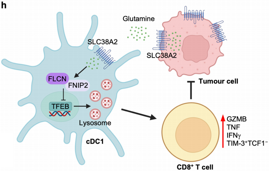 不仅如此,研究者们还在cDC1s细胞中找到了与谷氨酰胺代谢紧密相关的另一个分子,即FLCN蛋白。没了FLCN蛋白,即使向cDC1细胞提供大量的谷氨酰胺,也无法提升其抗原提呈和激活T细胞的能力。另外,也揭示了cDC1s细胞中由FLCN介导的相关信号通路。