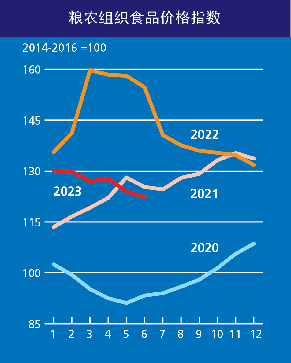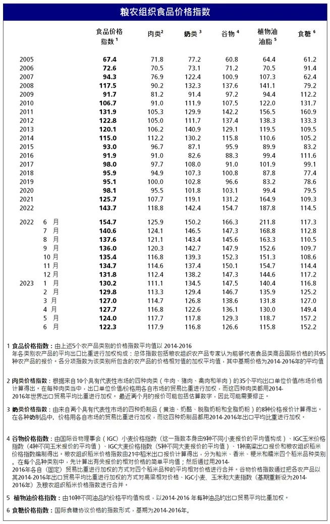 粮农组织食品价格指数是衡量一揽子食品类商品国际价格月度变化的尺度。2023年6月,粮农组织食品价格指数平均为 122.3 点,环比下降 1.4%,与2022年3月的历史高点相比下跌了23.4%。