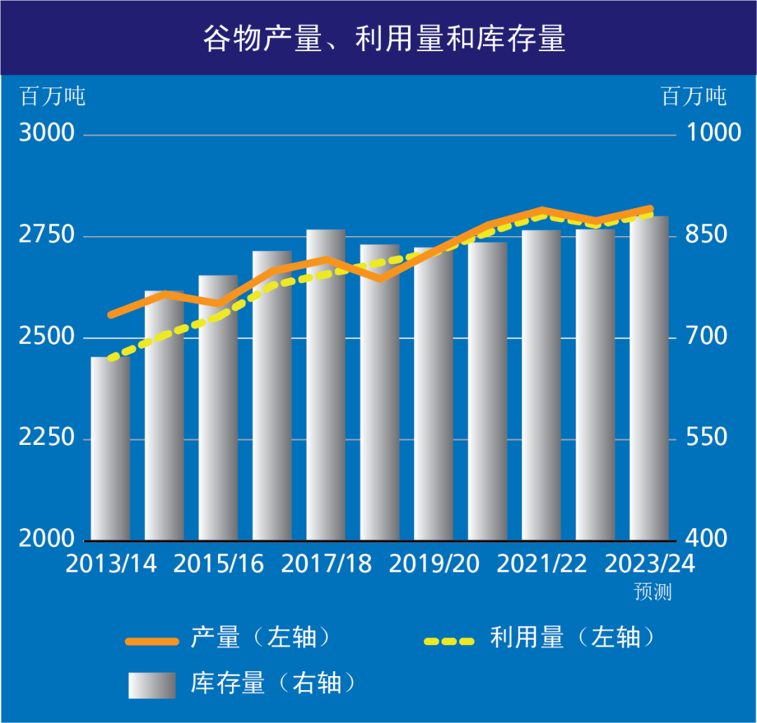 2023/24年,全球谷物消费预计为28.05亿吨,同比增长0.9%,主要原因是粗粮消费量上升,尤其是玉米饲料的使用量呈递增趋势。