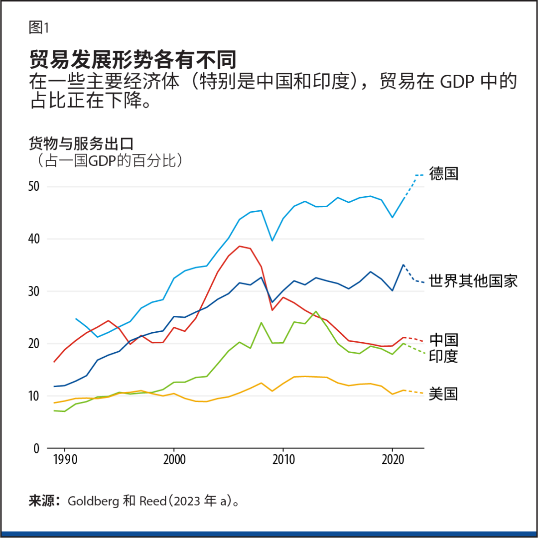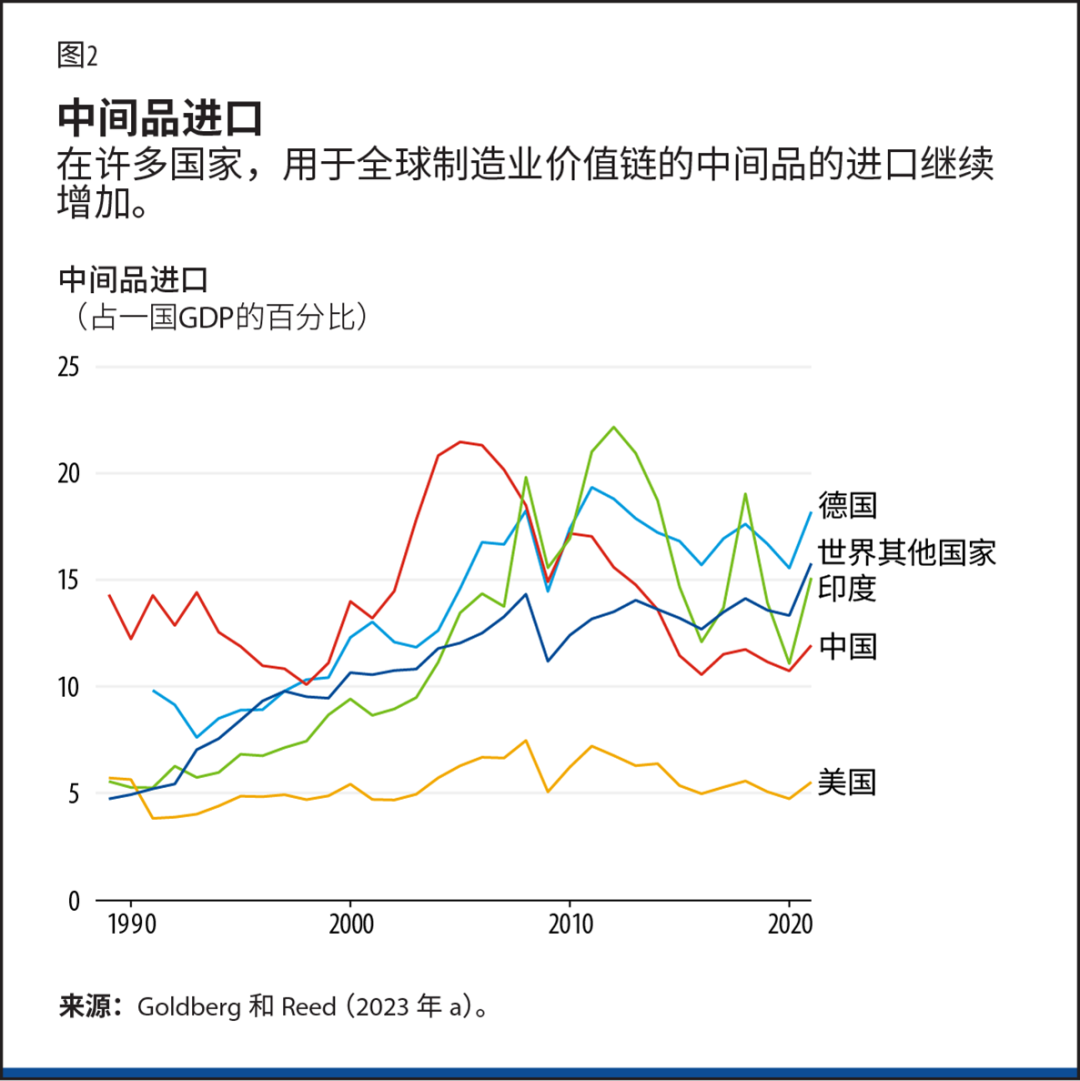 今天,仍然没有确凿的证据表明国际贸易正在去全球化。以美元衡量,全球贸易增速在2008至2009年全球金融危机后有所放缓,并在2020年新冠疫情之初急剧下降。但自那以后,贸易已经反弹至有史以来的最高水平。从占GDP的比重来看,全球贸易小幅下降,这主要是由中国和印度造成的——其中,中国这些年实施了“双循环”战略,其一方面优先关注国内消费,另一方面又保持了对国际贸易和投资的开放。这反映出两国在过去几十年的出口高速增长已告一段落,以及二者少于往年的中间品进口。但是,从占GDP的比重来看,世界其他地区的中间品进口量仍在增长。而出口也是如此。