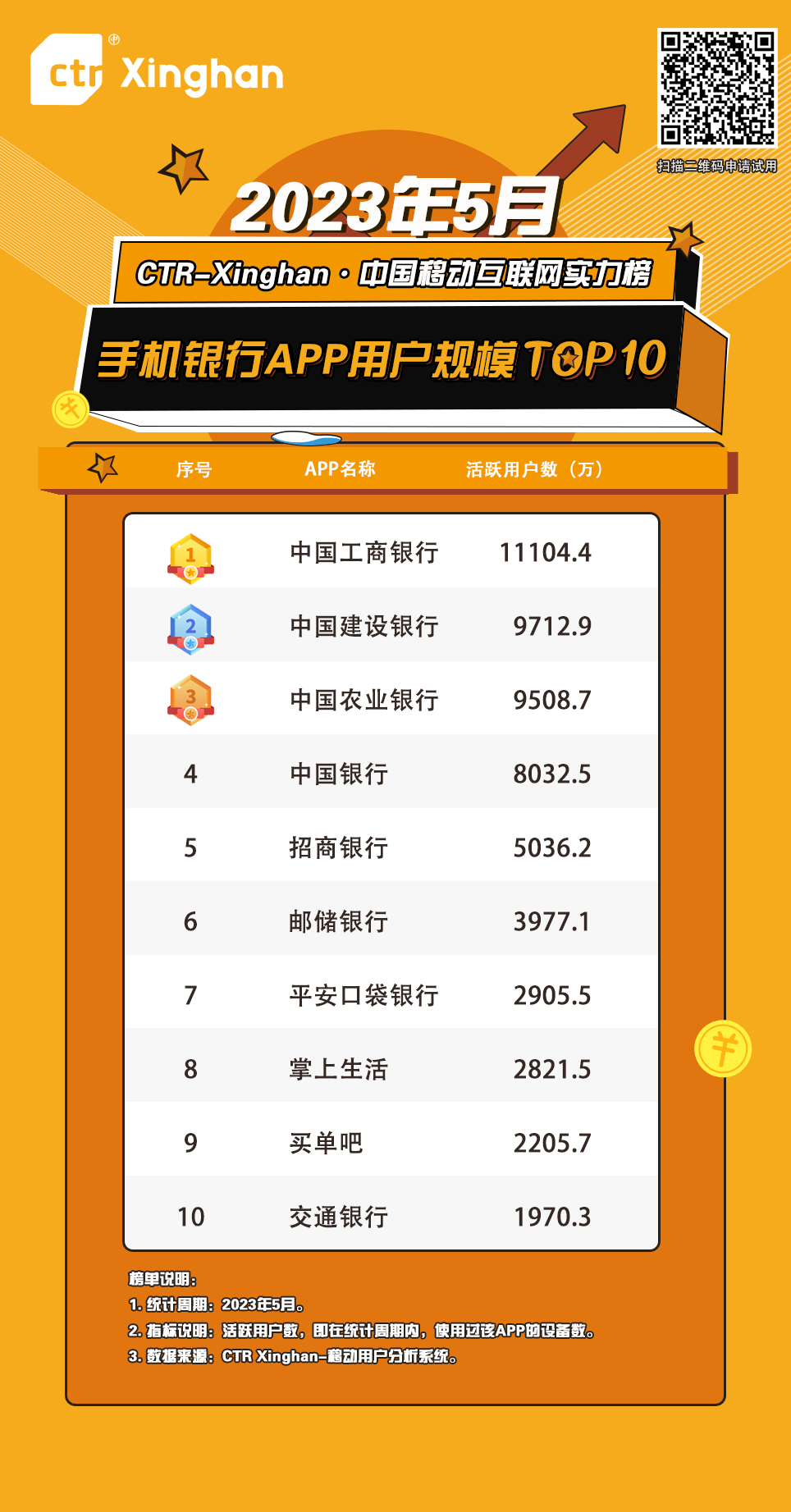 CTR:2023年5月移动互联网APP实力排行 导读:榜单由“APP用户规模TOP50玩家榜”、“亿级玩家增速TOP榜”以及“细分行业TOP榜”三大榜单组成。基于CTR-Xinghan(星汉)移动用户分析系统2023年5月数据,通过APP月活跃用户数和同比增长率两个核心指标,分别揭晓中国移动互联网50个头部APP、亿级玩家以及手机银行细分领域的真实价值。 APP用户规模TOP50玩家榜 亿级玩家增速TOP榜 细分行业APP 用户规模TOP榜–手机银行 更多阅读:QuestMobile:2025年3月移动端原生App月活5.91亿Apptopia:2021年亚马逊在购物应用安装量中排名全球第四照片和图像编辑应用程序为何盈利?健身App下载近1700万次,刘畊宏男孩女孩也要努力啊data.ai:2021年App Store搜索关键词热度榜Finbol :2021上半年全球消费者在 App Store 上总支出达到 415 亿美元七麦研究院:2021年8月热门移动应用排行榜App Annie:2017年10月中国App市场解析App annie:2017 年11月中国App市场解析App Annie:2017年10月全球App市场解析App Annie:2017 年 9 月全球应用下载量和收入榜单解析App Annie:2017年9月中国应用下载量和收入榜单解析App Annie:2018 年应用经济十大预测App Annie:2017 年度移动应用经济预测哈佛商业评论:养成同理心的习惯,能避免工作中的精疲力竭