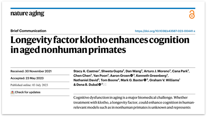 [1] Castner SA, Gupta S, Wang D, et al. Longevity factor klotho enhances cognition in aged nonhuman primates. Nat Aging (2023).