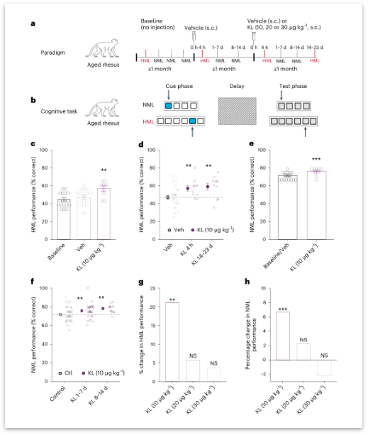 数据表明,10 μg/kg的Klotho增强了老年恒河猴的认知能力,这种效应在NML和HML的记忆测量中都持续了至少2周。