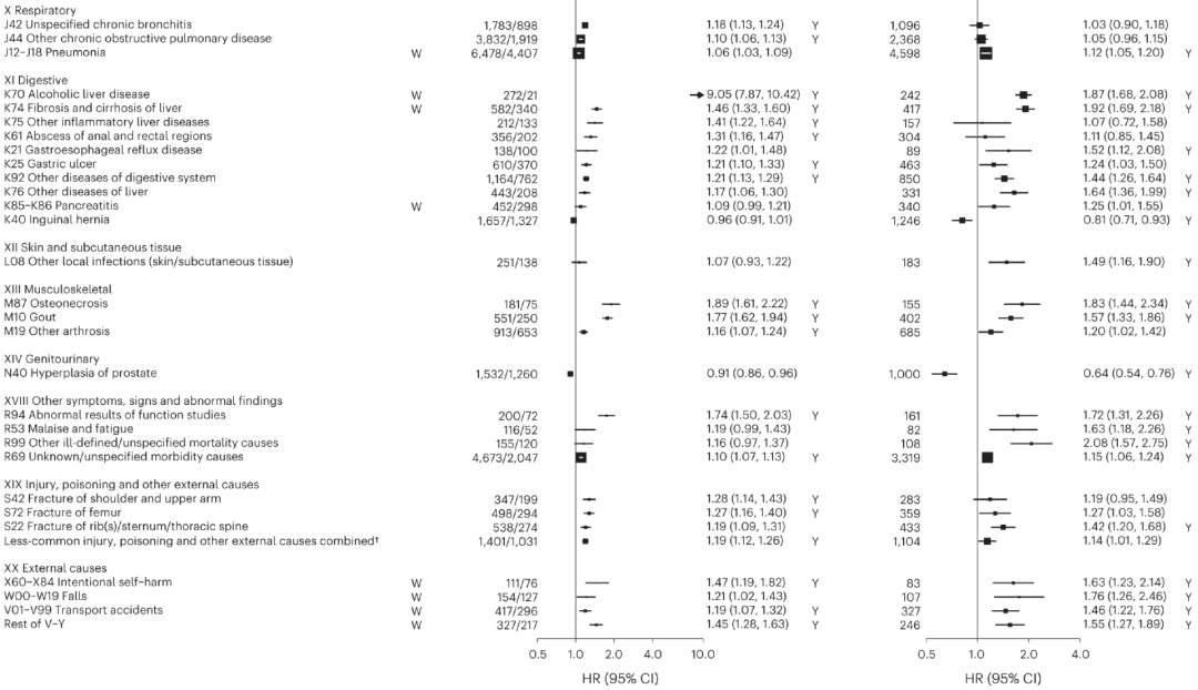 在中位12.1年的随访后,44,027名男性饮酒者在35-84岁期间经历了至少一次住院或死亡。而对比国际疾病分类ICD-10版中记录在案的207种疾病发现,当前饮酒的男性中共统计到107,857个疾病相关事件。