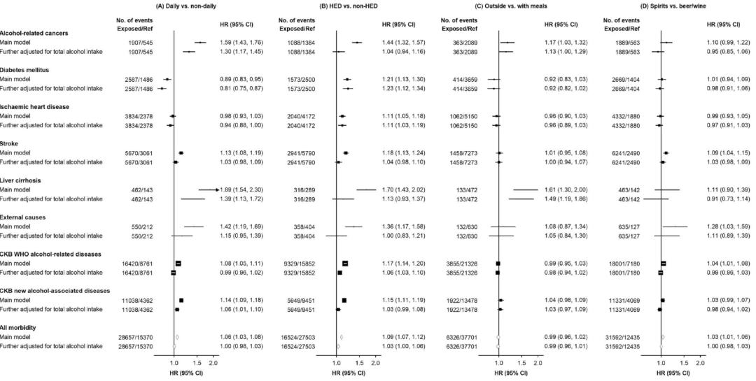 综上,这项前瞻性研究全面地评估了饮酒对中国成年人的疾病风险影响。在男性中,饮酒与61种疾病风险的显著增加有关,甚至包括了33种WHO未报告的酒精相关疾病。此外,有不良饮酒习惯,比如每日饮酒、大量偶发性饮酒、就餐之外时间饮酒以及常饮用烈酒的中国男性更要注意主要疾病风险的上升。