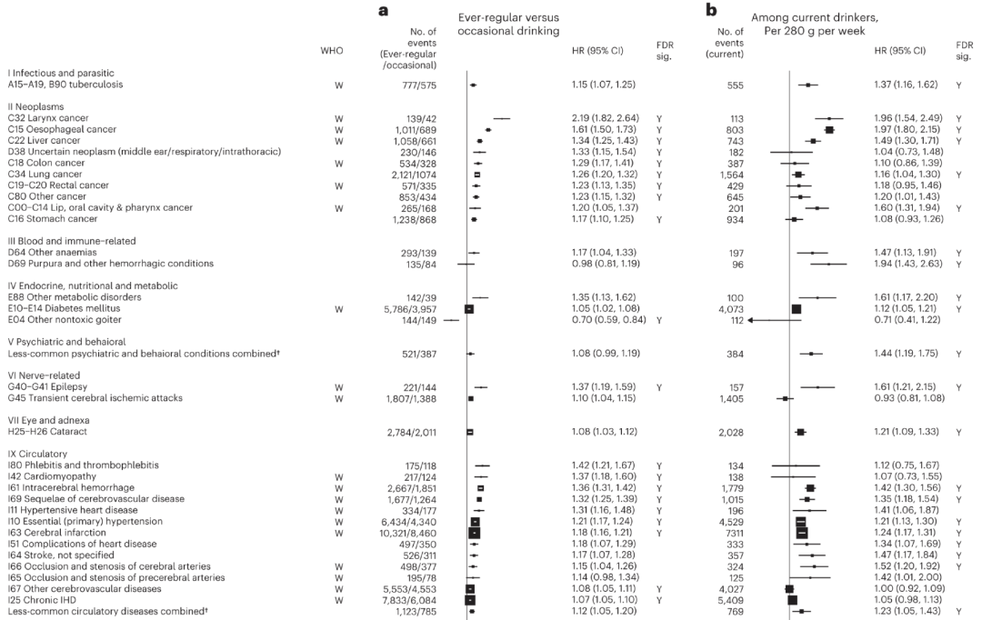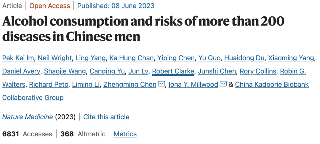 [1]Im, P.K., Wright, N., Yang, L. et al. Alcohol consumption and risks of more than 200 diseases in Chinese men. Nat Med (2023). https://doi.org/10.1038/s41591-023-02383-8
