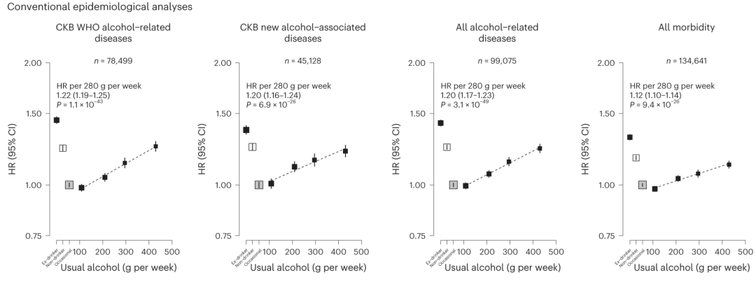 其中,仅有28种疾病此前就被世界卫生组织(WHO)确定为“与酒精摄入有关”,比如结核、喉癌、食道癌、肝癌、癫痫等等。这28种疾病中,有22种与酒精摄入量有着显著的剂量–反应关系——每周每多饮用280g酒精,全因死亡风险随之增加约22%。