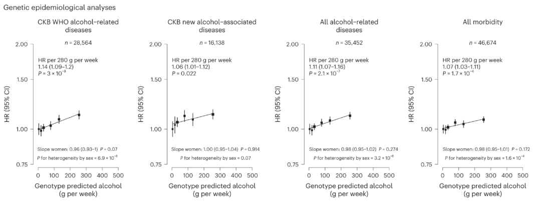 其实,本研究不仅仅纳入了中国男性的数据,但由于中国女性中经常饮酒的只有不到2%,所以用作“遗传分析中的有效对照组”再合适不过。且依此证实,男性中较高的疾病风险确实是由饮酒引起的,而非其他原因。