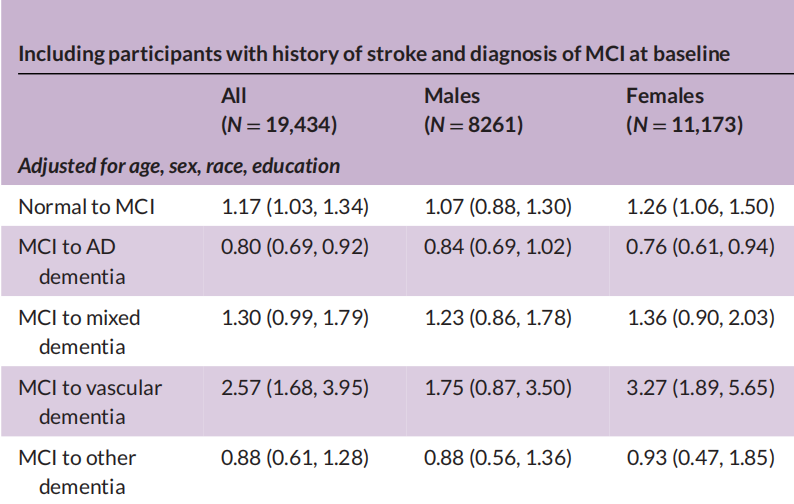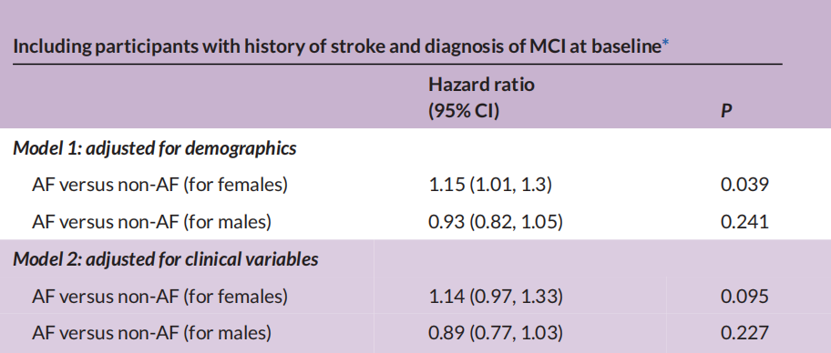 此外,相较于没有房颤的女性,患有房颤但基线认知功能正常的女性,从正常到MCI,以及从MCI到血管性痴呆的疾病进展风险更高(HR分别为1.26和3.27)。