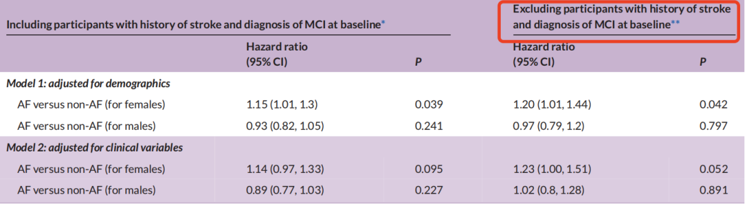 在调整人口统计学变量后,与男性(HR=0.97)相比,女性房颤与疾病进展速度更快有关(HR=1.20),在调整临床变量以后,两者之间的相关性也变小了。