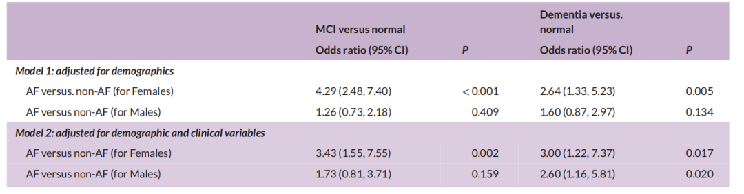 具体而言,与没有房颤的女性相比,患有房颤的女性发生MCI(OR=3.43,P=0.002)和痴呆风险更高(OR=3.00,P=0.017),而患有房颤的男性发生MCI和痴呆风险的OR仅有1.73和2.60。