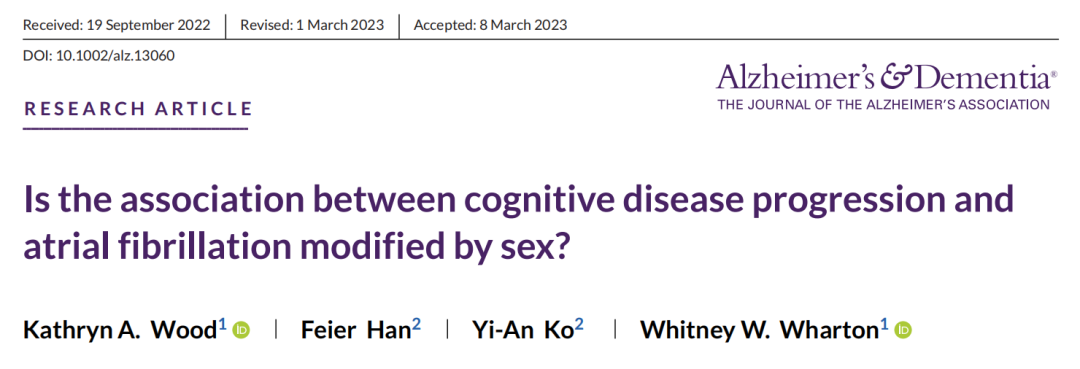 [1]Wood, KA, Han, F, Ko, YA, Wharton, WW. Is the association between cognitive disease progression and atrial fibrillation modified by sex?. Alzheimer’s Dement. 2023; 1- 11.