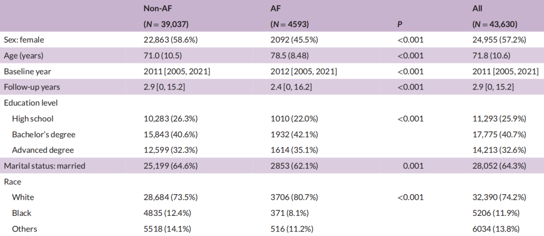 研究最终纳入了截至2021年3月NACC数据库中的43630名参与者的数据,其中基线有房颤的患者共4593名,平均年龄为78.5岁,46%为女性,中位随访时间约为4年。所有参与者入组后需要每年至少进行三次门诊就诊,在此期间接受心理测试,并按照正常认知、MCI和痴呆症进行分类。