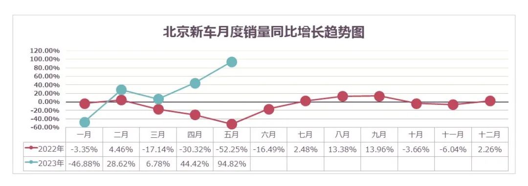 5 月份北京新车交易 4.99 万辆,环比下降 15.13%,环比增幅低于全国 25.43 个百分点;同比增长 94.82%,同比增幅高于全国 66.92 个百分点。