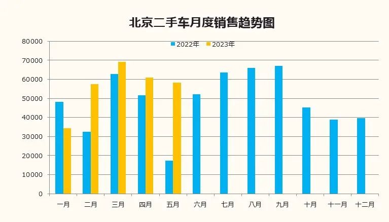 5月份北京市二手车成交过户 5.82 万辆次,环比下降 4.63%,同比增长 135.19%,新旧车比为 1:1.17。