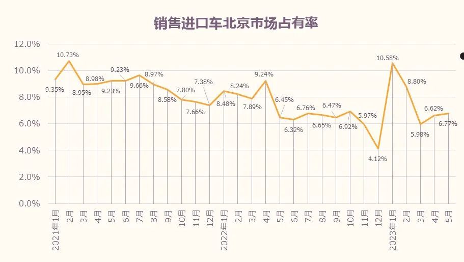 5月北京进口车销量占北京新车交易总量 6.77%,占有率环比上涨 0.15 个百分点,同比增长 0.32 个百分点。