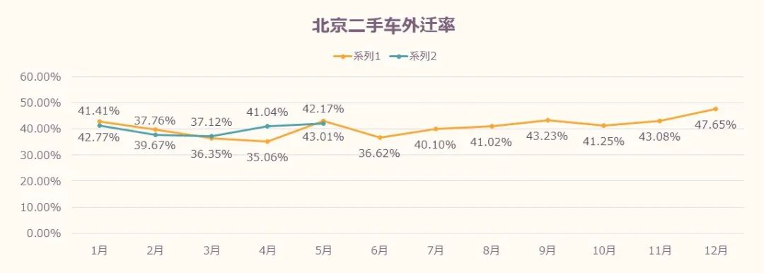 5月份北京二手车交易外迁率为 42.17%,外迁率环比增长 1.13 个百分点,同比下降 0.84 个百分点。1-5 月北京二手车外迁累计达到 11.12 万辆。