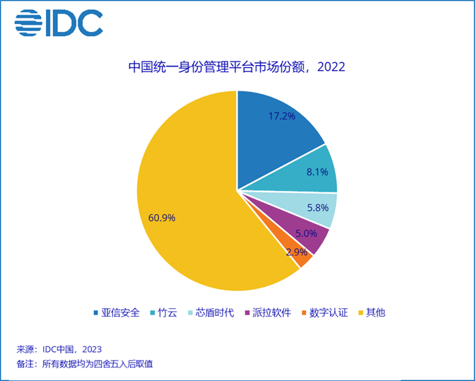 IDC于2023年7月正式发布了针对中国统一身份管理平台产品的市场份额研究报告,即:《中国统一身份管理平台市场份额,2022:安全建设,身份先行》(# CHC50360223)。报告针对2022年中国统一身份管理平台市场的规模、增长速度、主要玩家、市场与技术的发展趋势等内容进行了详细研究。IDC数据显示,中国统一身份管理平台市场在2022年实现了7.1%的同比增长,规模达到3.5亿美元。由于身份安全在整体网络安全建设中处于十分关键的地位,市场中提供身份管理的厂商众多,而头部玩家仍然以在身份安全市场具备长期技术积累和市场培育的专业厂商为主,例如亚信安全、竹云、芯盾时代、派拉软件、数字认证等,具体情况详见下图: