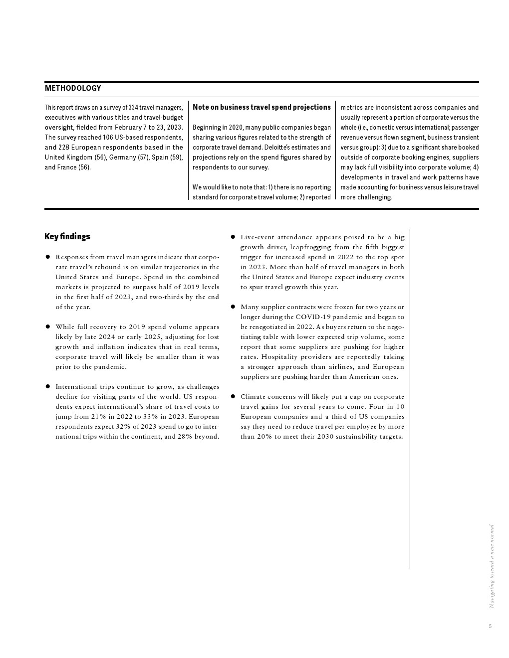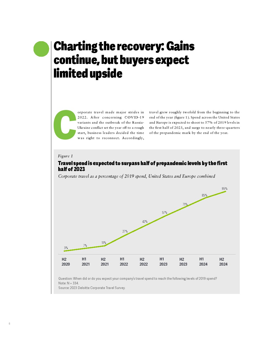 德勤发布了“2023年商务旅行调查”。差旅经理的反馈表明,商务旅行在美国和欧洲的反弹轨迹相似。预计到2023年上半年,这两个市场的综合支出将超过2019年水平的一半,到今年年底将超过2/3。