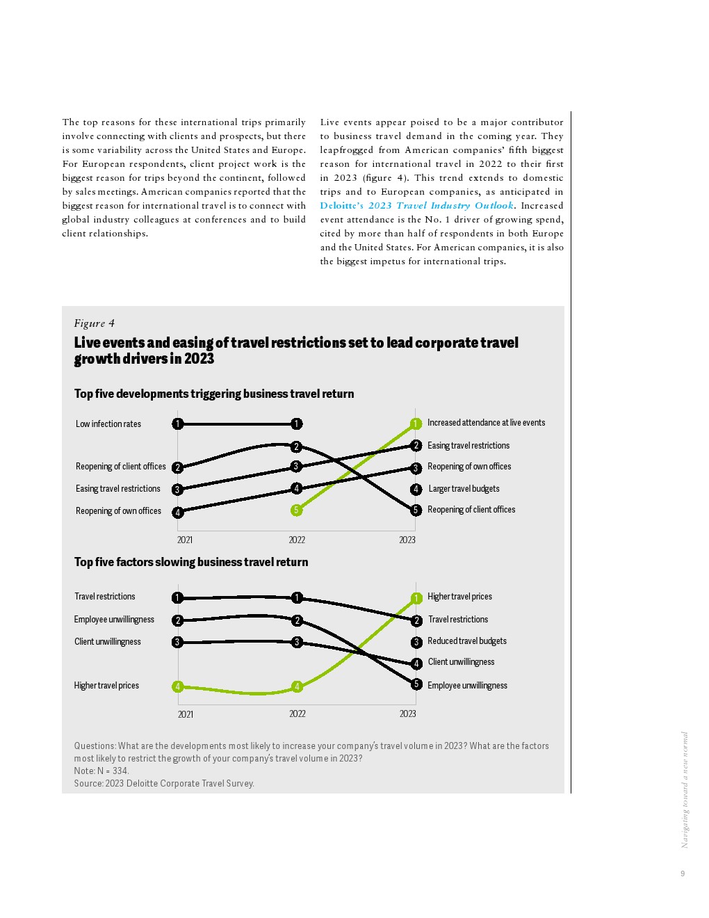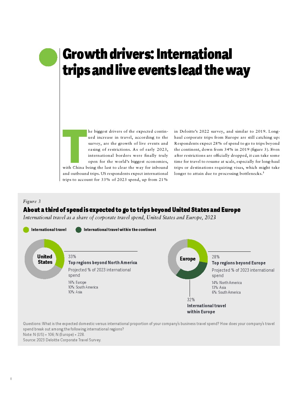 参与现场活动有望成为一个重要的增长动力,从2022年的第五大增长因素跃升至2023年的首位。在美国和欧洲,超过一半的差旅经理预计,今年的行业活动将刺激旅游业的增长。