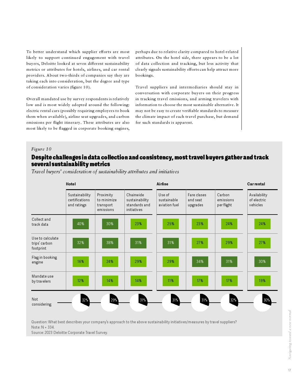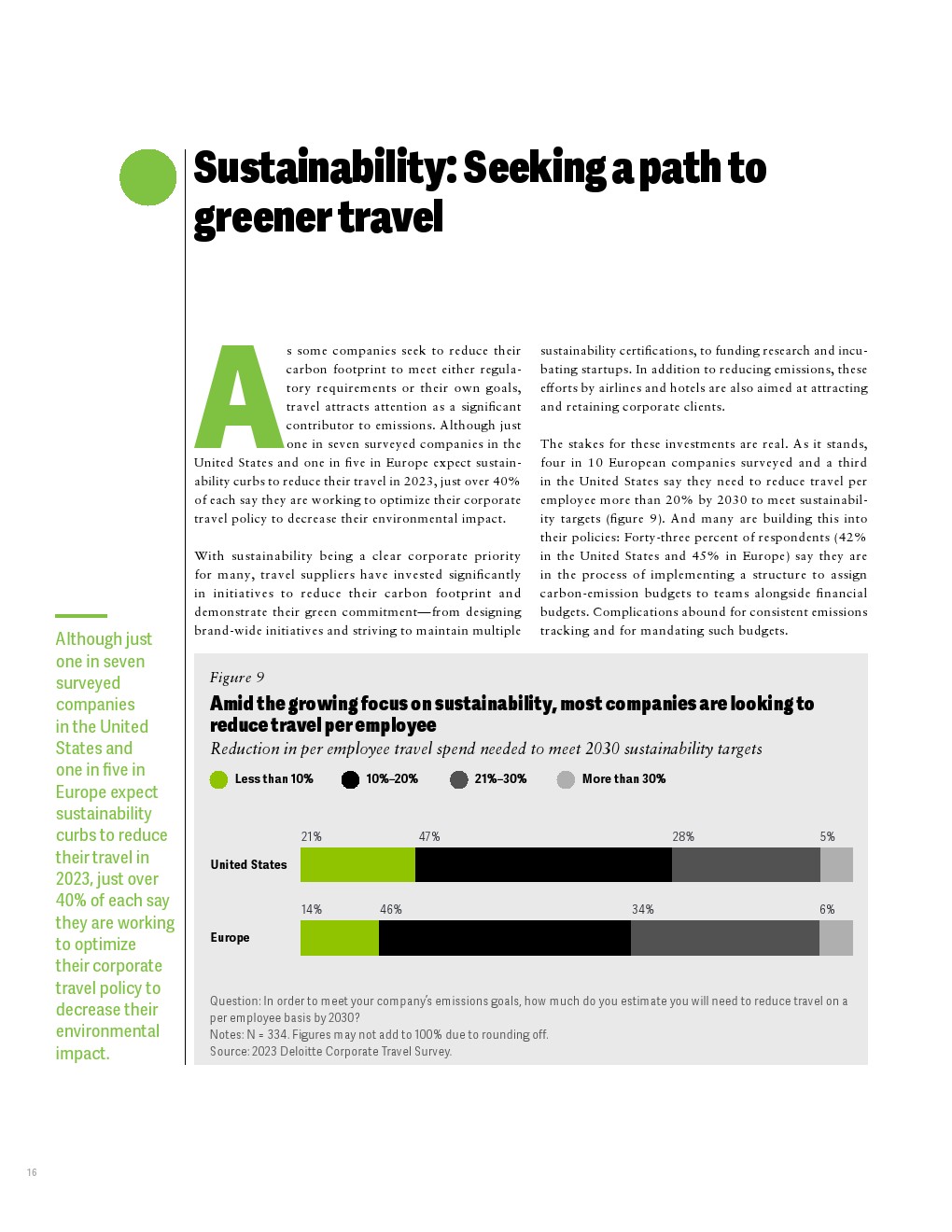 气候问题可能会在未来几年限制商务旅行的增长。4/10的欧洲公司和1/3的美国公司表示,为了实现2030年的可持续发展目标,他们需要将每位员工的出差次数减少20%以上。