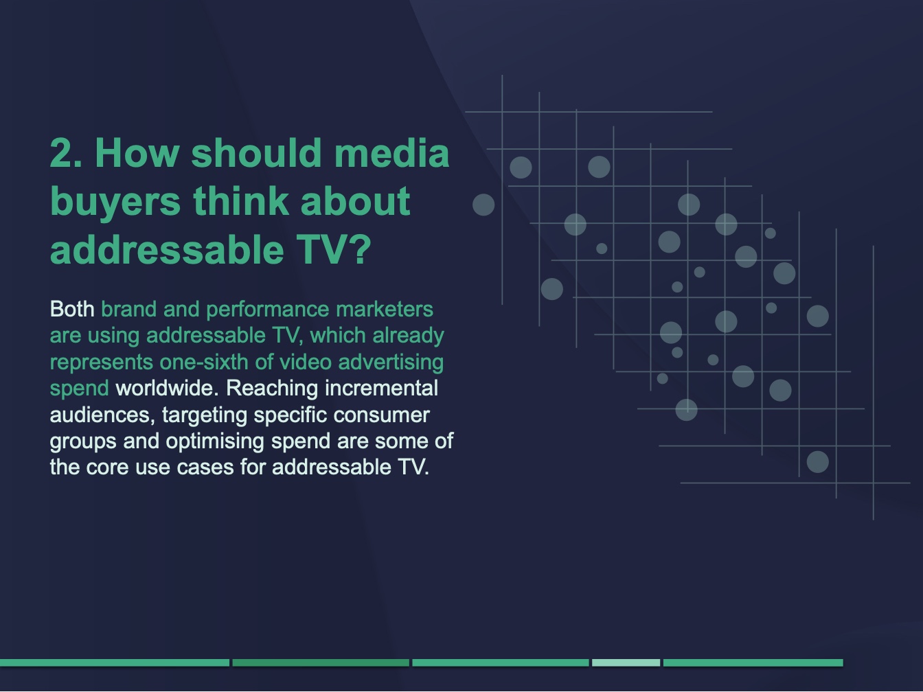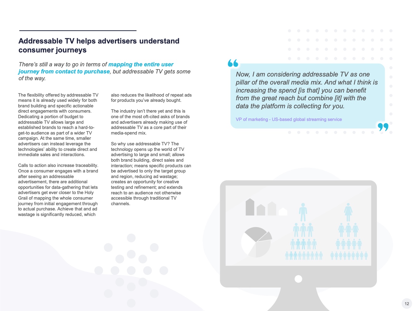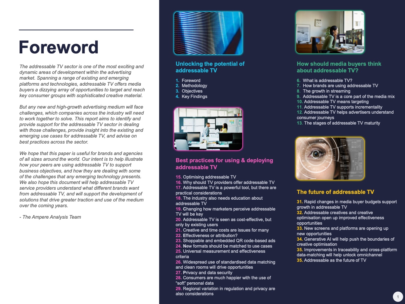可寻址电视市场是一个庞大而快速增长的媒体支出领域。世界各地的营销人员将大约六分之一的视频广告预算用于可寻址电视。在美国等成熟市场,平均每五分之一的视频广告花费是在可寻址电视平台上的。