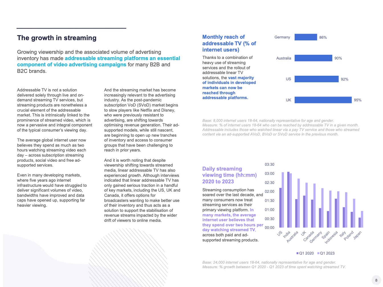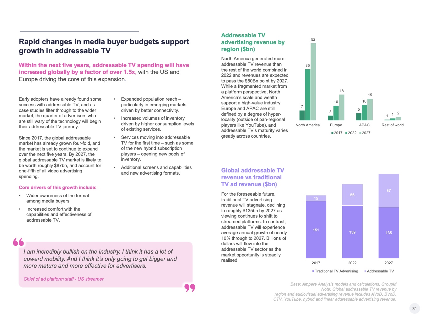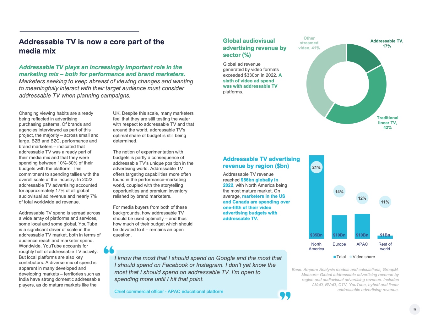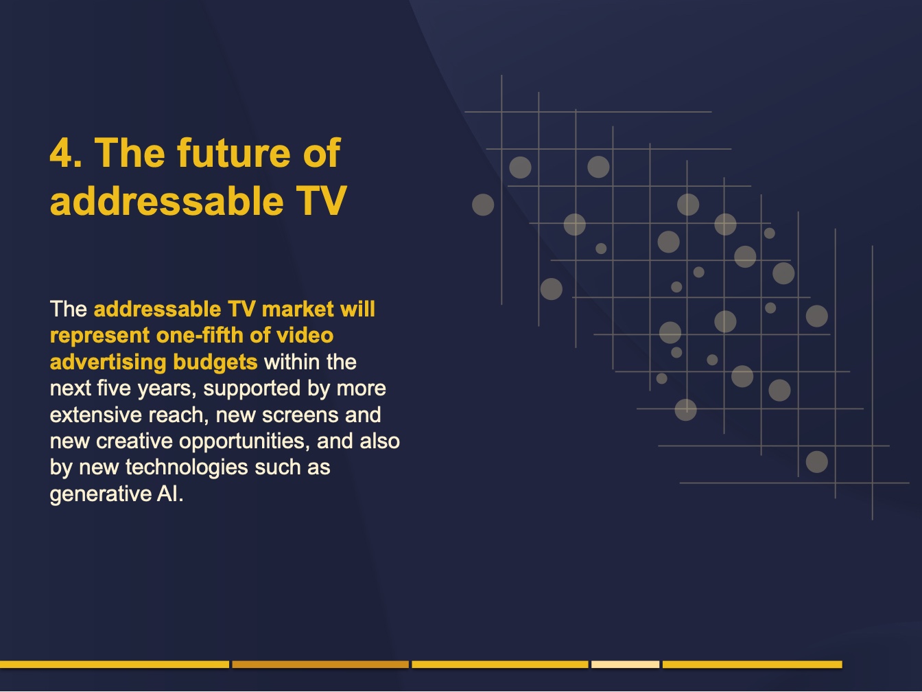 可寻址电视市场是一个庞大而快速增长的媒体支出领域。世界各地的营销人员将大约六分之一的视频广告预算用于可寻址电视。在美国等成熟市场,平均每五分之一的视频广告花费是在可寻址电视平台上的。