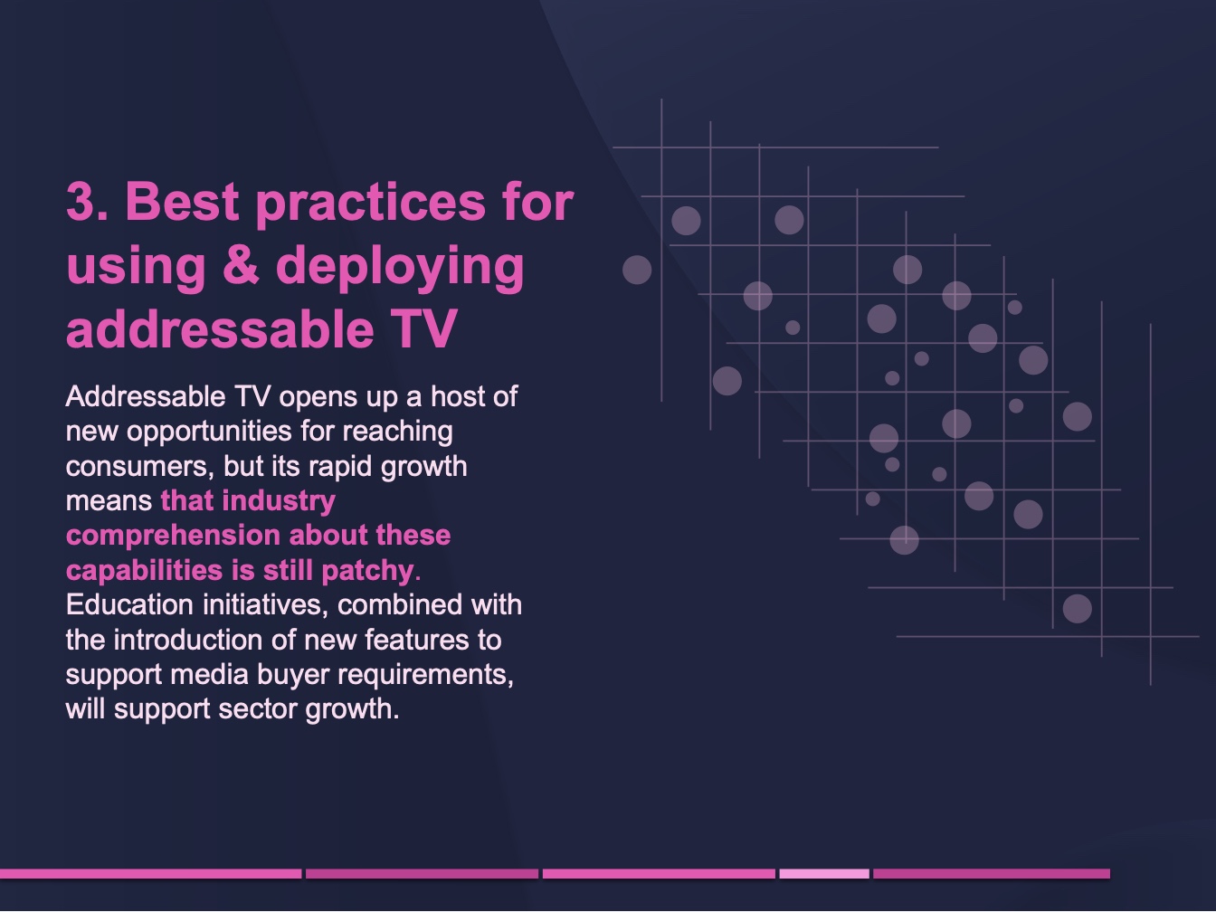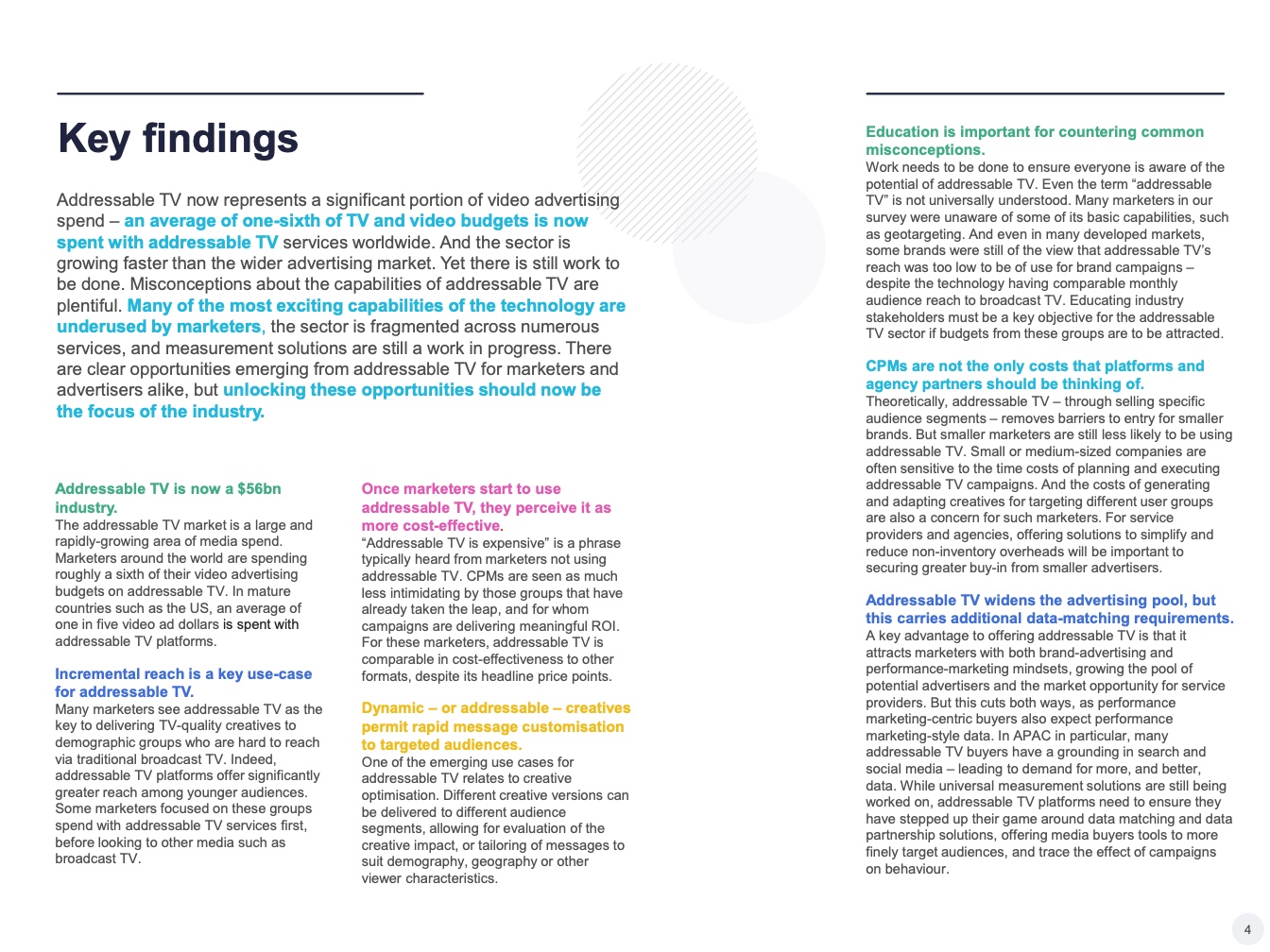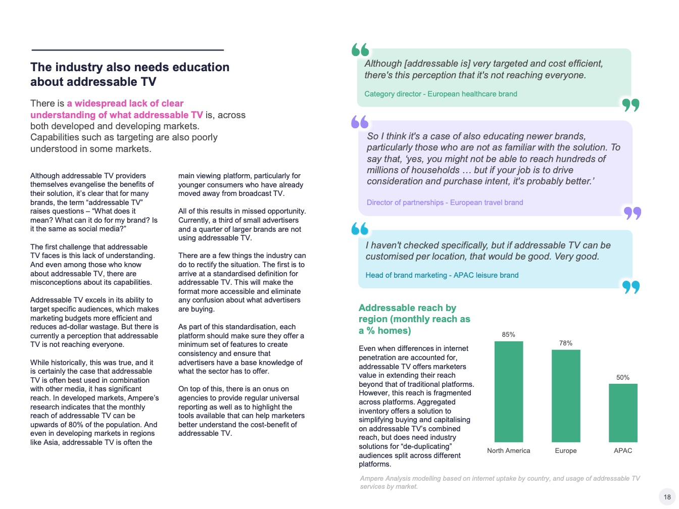 我们需要努力确保每个人都了解可寻址电视的潜力。在调查中,许多营销人员并不知道可寻址电视的一些基本功能,如地理定位。即使在许多发达市场,一些品牌仍认为可寻址电视的覆盖率太低,无法用于品牌营销活动,尽管该技术的每月受众覆盖率与广播电视不相上下。如果要吸引这些群体的预算,教育行业利益相关者必须成为可寻址电视行业的关键目标。