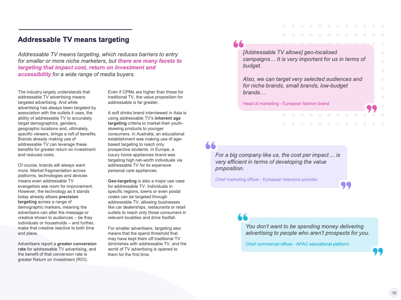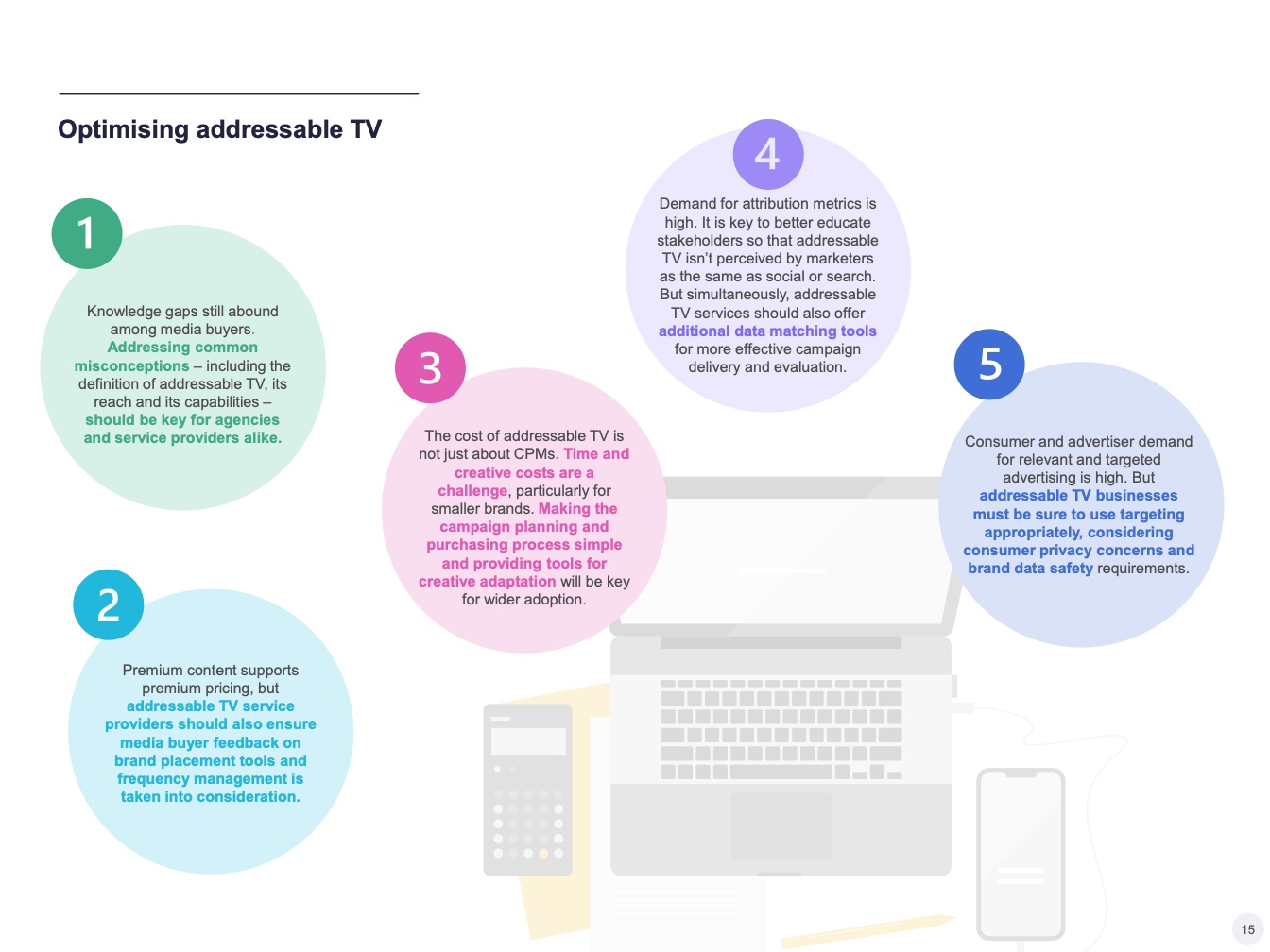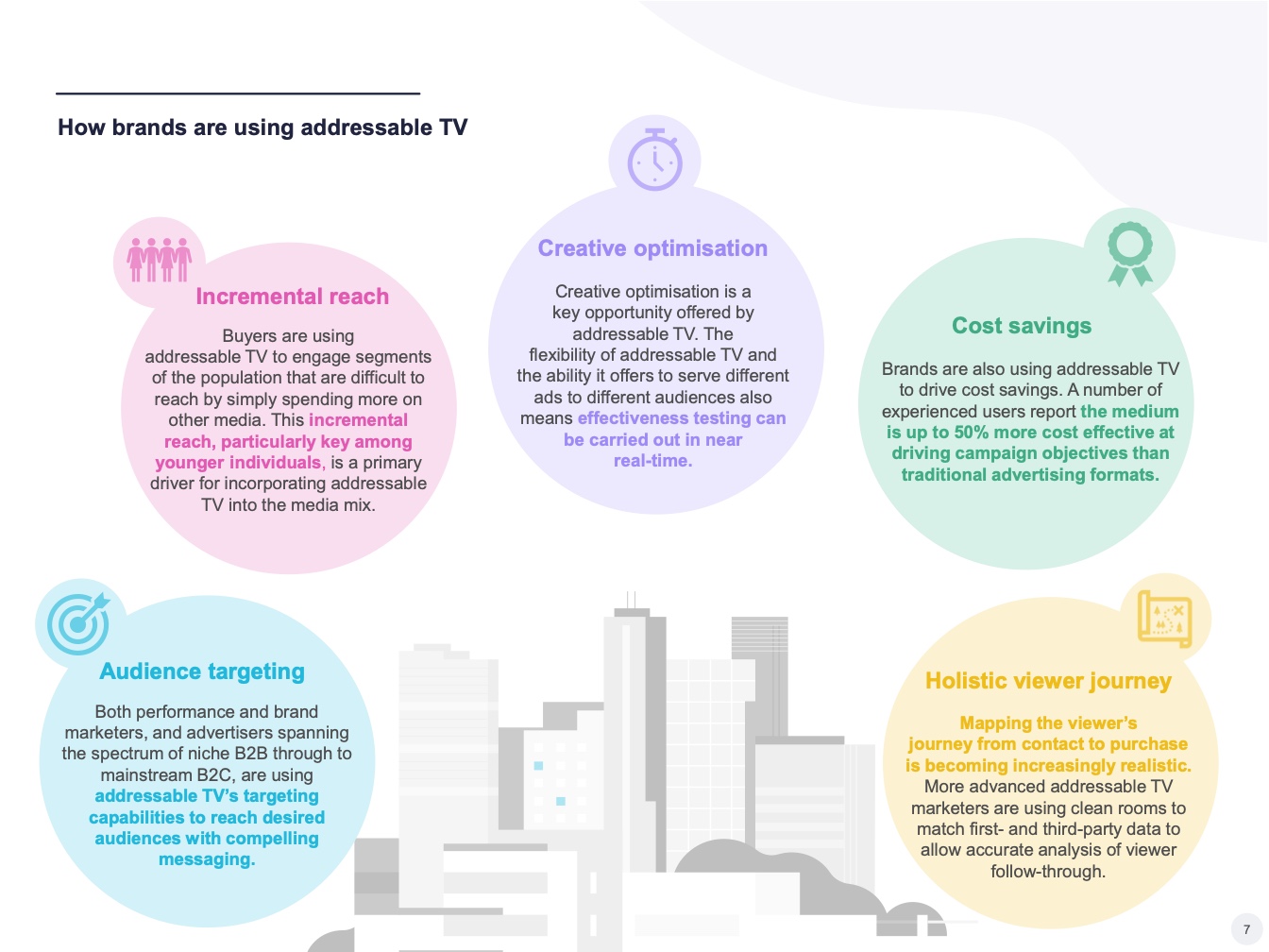 我们需要努力确保每个人都了解可寻址电视的潜力。在调查中,许多营销人员并不知道可寻址电视的一些基本功能,如地理定位。即使在许多发达市场,一些品牌仍认为可寻址电视的覆盖率太低,无法用于品牌营销活动,尽管该技术的每月受众覆盖率与广播电视不相上下。如果要吸引这些群体的预算,教育行业利益相关者必须成为可寻址电视行业的关键目标。