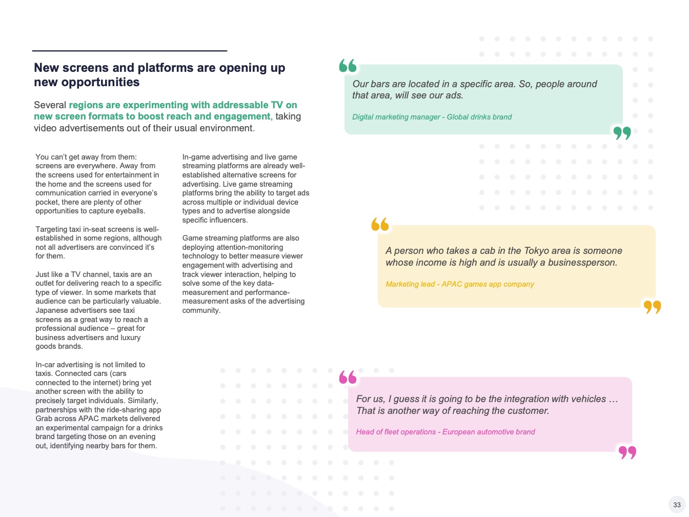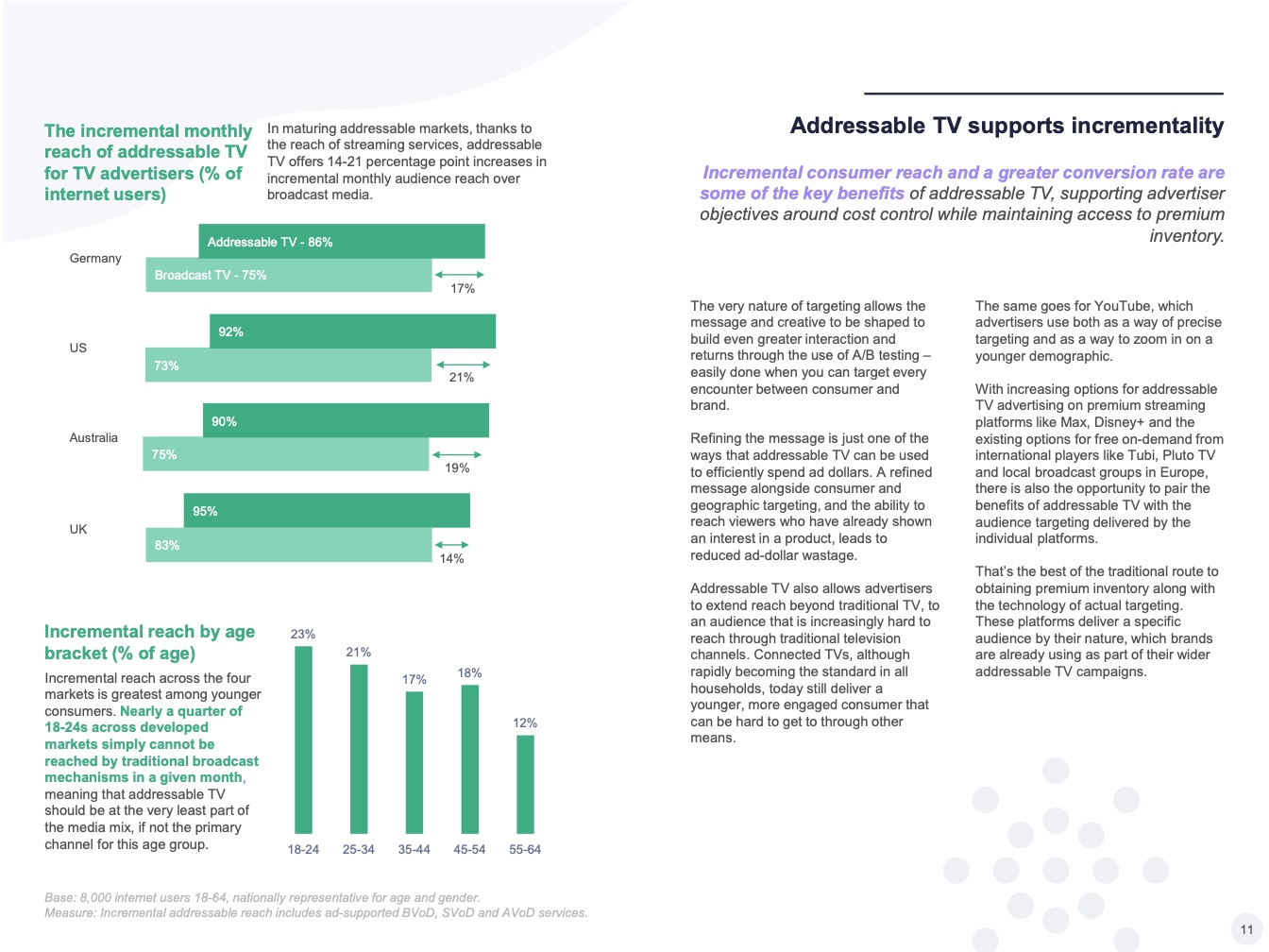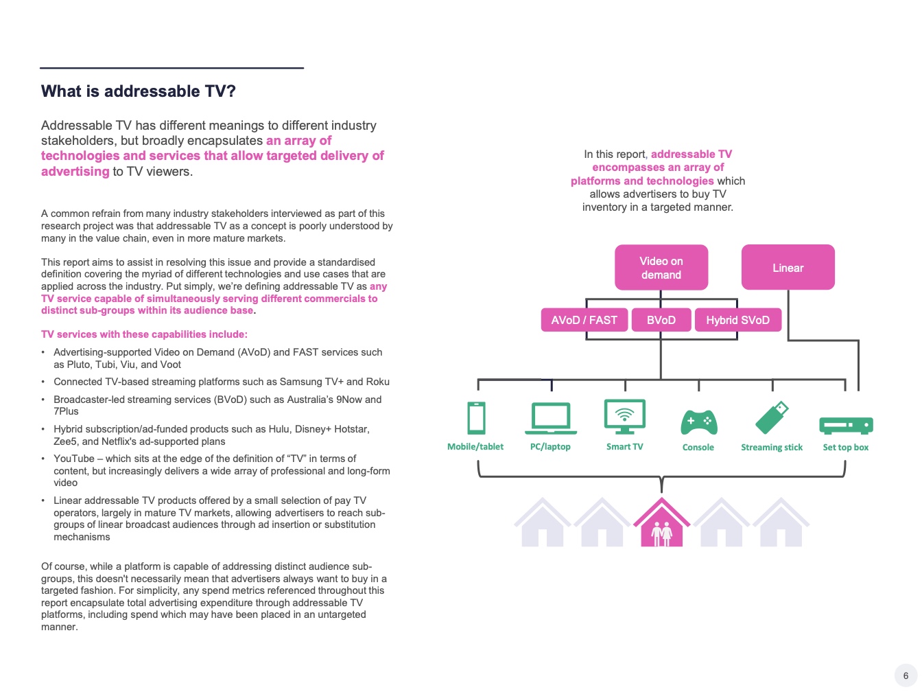 – 少数付费电视运营商提供的线性可寻址电视产品,主要在成熟的电视市场,允许广告商通过广告插播或替代机制接触到线性广播受众的子群体。