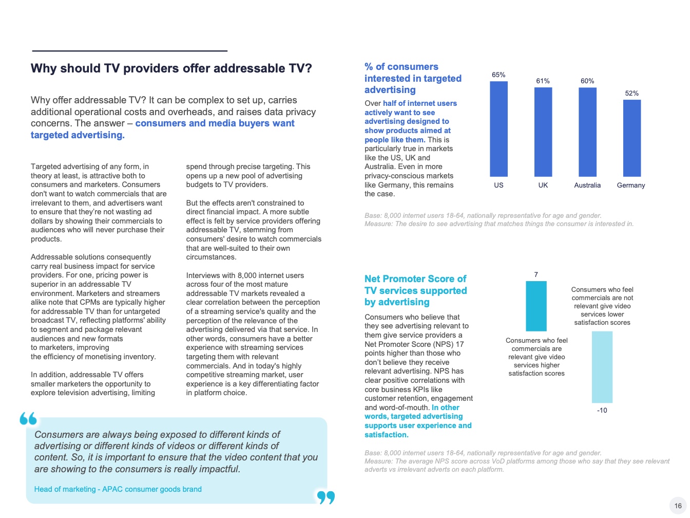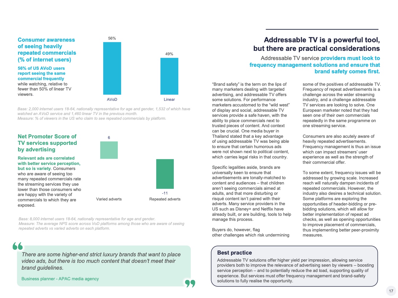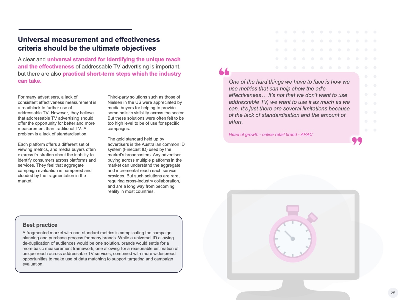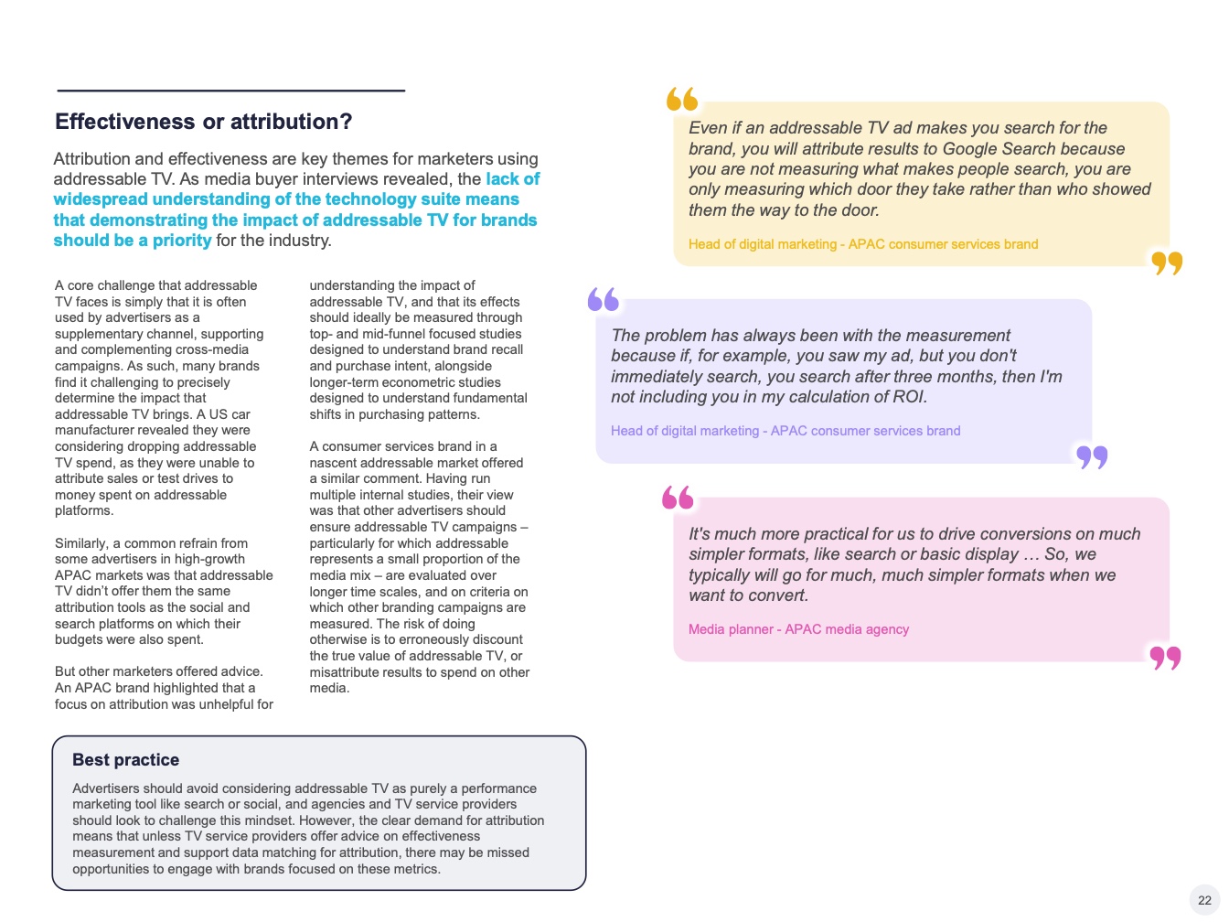 提供可寻址电视的一个关键优势:它可以吸引从事品牌营销和效果营销的营销人员,增加潜在广告客户的数量,并为服务提供商提供市场机会。但这是双向的,因为以效果营销为中心的买家也希望获得对应形式的数据。特别是在亚太地区,许多可寻址电视买家都有搜索和社交媒体方面的基础—这导致了对更多、更好的数据的需求。虽然通用测量解决方案仍在研究中,但可寻址电视平台需要确保其在数据匹配和数据合作解决方面更上一层楼,为媒体购买者提供更精细的目标受众定位工具,并追踪广告活动对行为的影响。