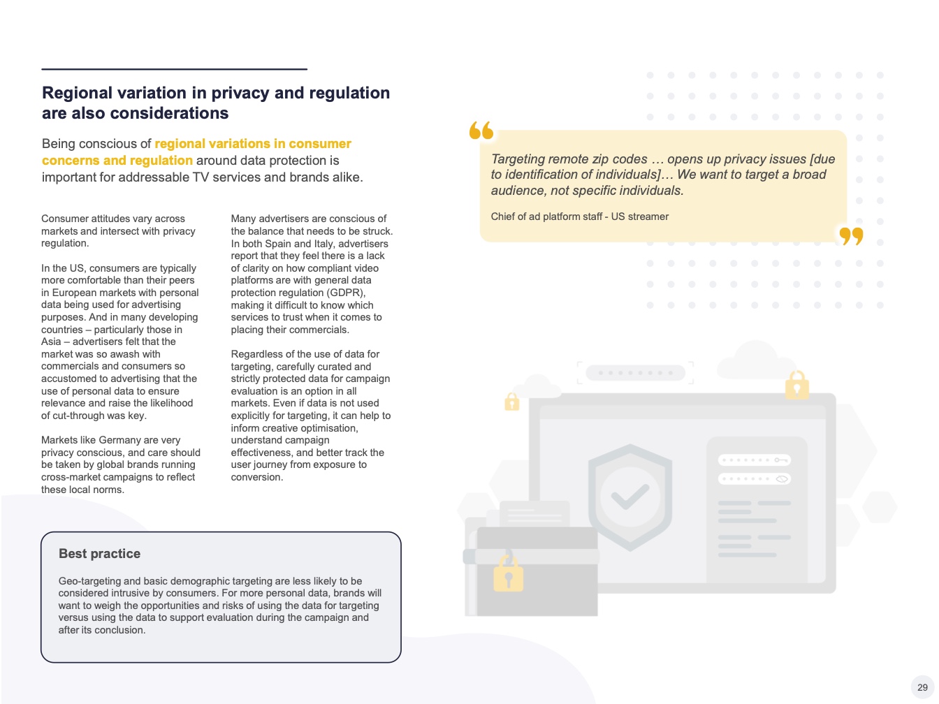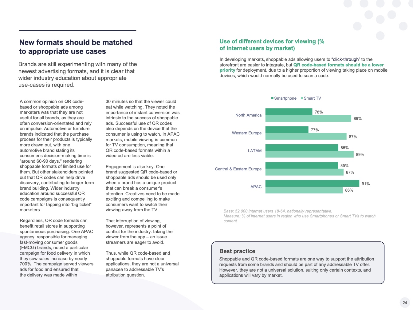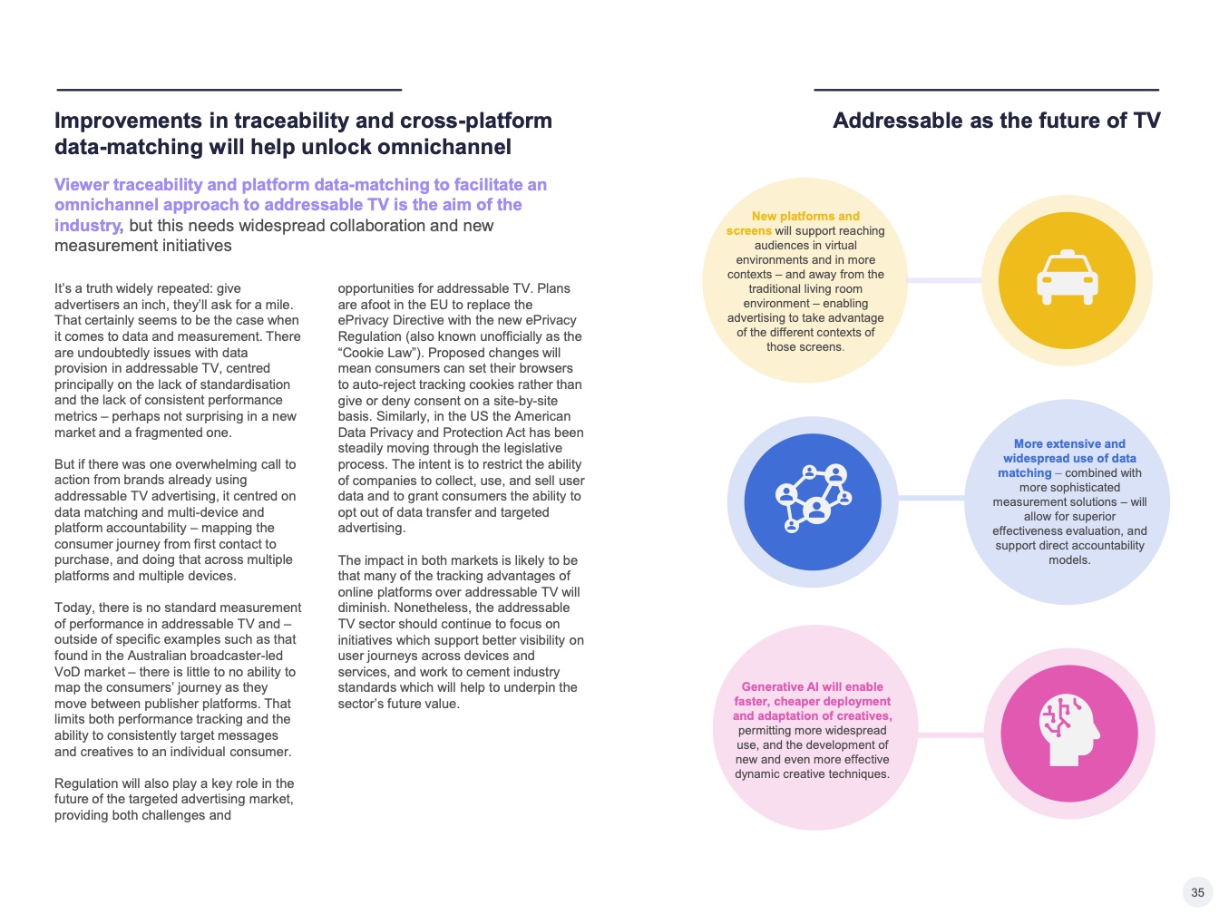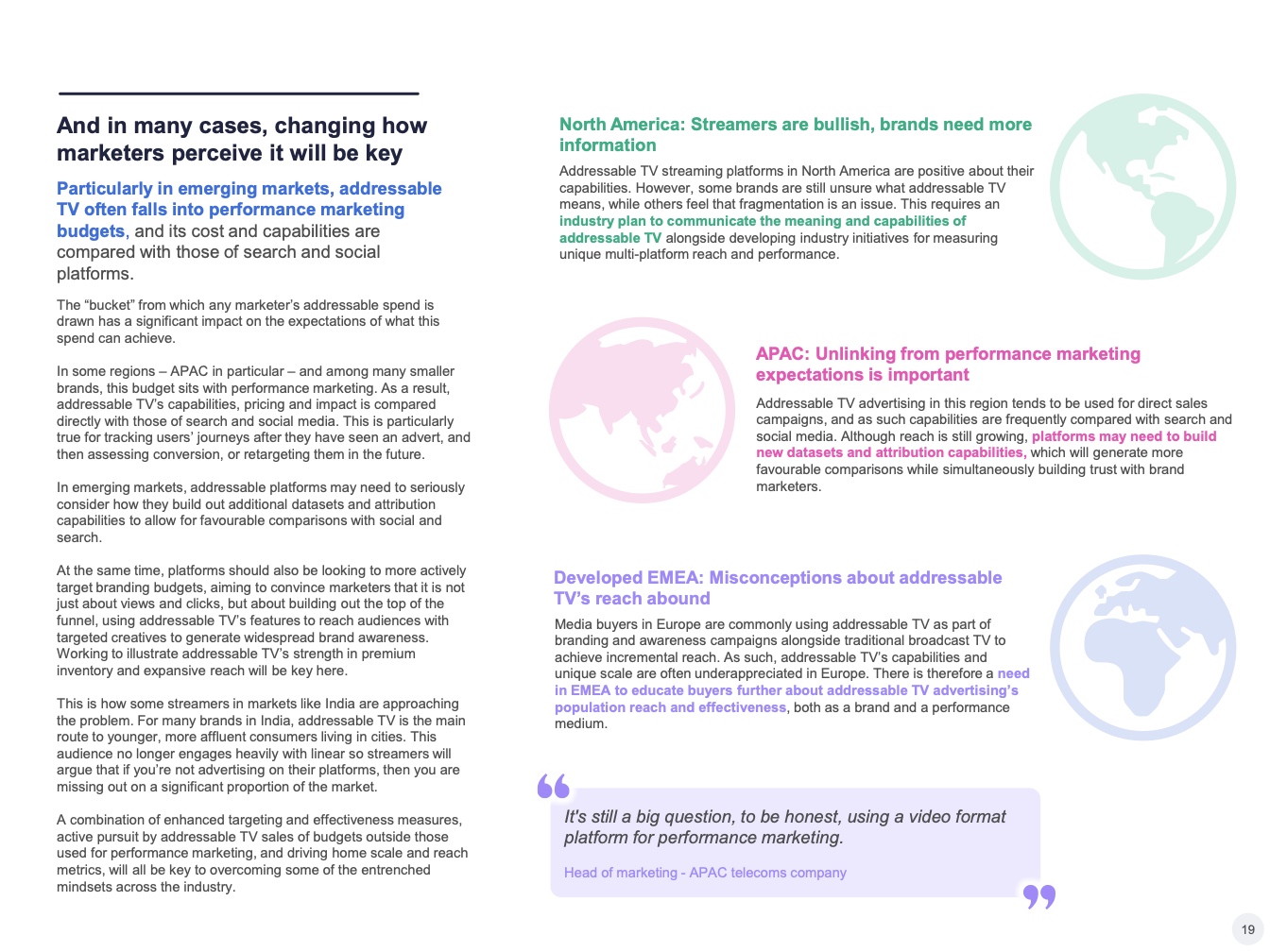 提供可寻址电视的一个关键优势:它可以吸引从事品牌营销和效果营销的营销人员,增加潜在广告客户的数量,并为服务提供商提供市场机会。但这是双向的,因为以效果营销为中心的买家也希望获得对应形式的数据。特别是在亚太地区,许多可寻址电视买家都有搜索和社交媒体方面的基础—这导致了对更多、更好的数据的需求。虽然通用测量解决方案仍在研究中,但可寻址电视平台需要确保其在数据匹配和数据合作解决方面更上一层楼,为媒体购买者提供更精细的目标受众定位工具,并追踪广告活动对行为的影响。