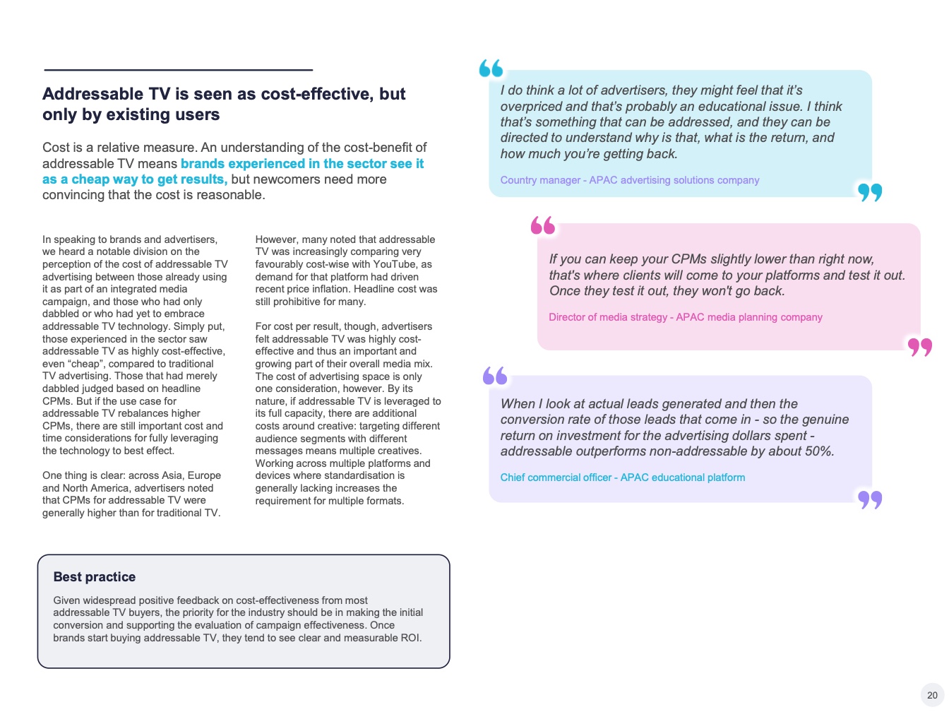 “可寻址电视很贵”这句话通常是从不使用可寻址电视的营销人员那里听到的。而对于那些已经开始使用可寻址电视,并且投放活动能获得可观ROI 的营销人员来说,CPM并没有那么“可怕”,尽管寻址电视的价格昂贵,但其成本效益与其他形式不相上下。