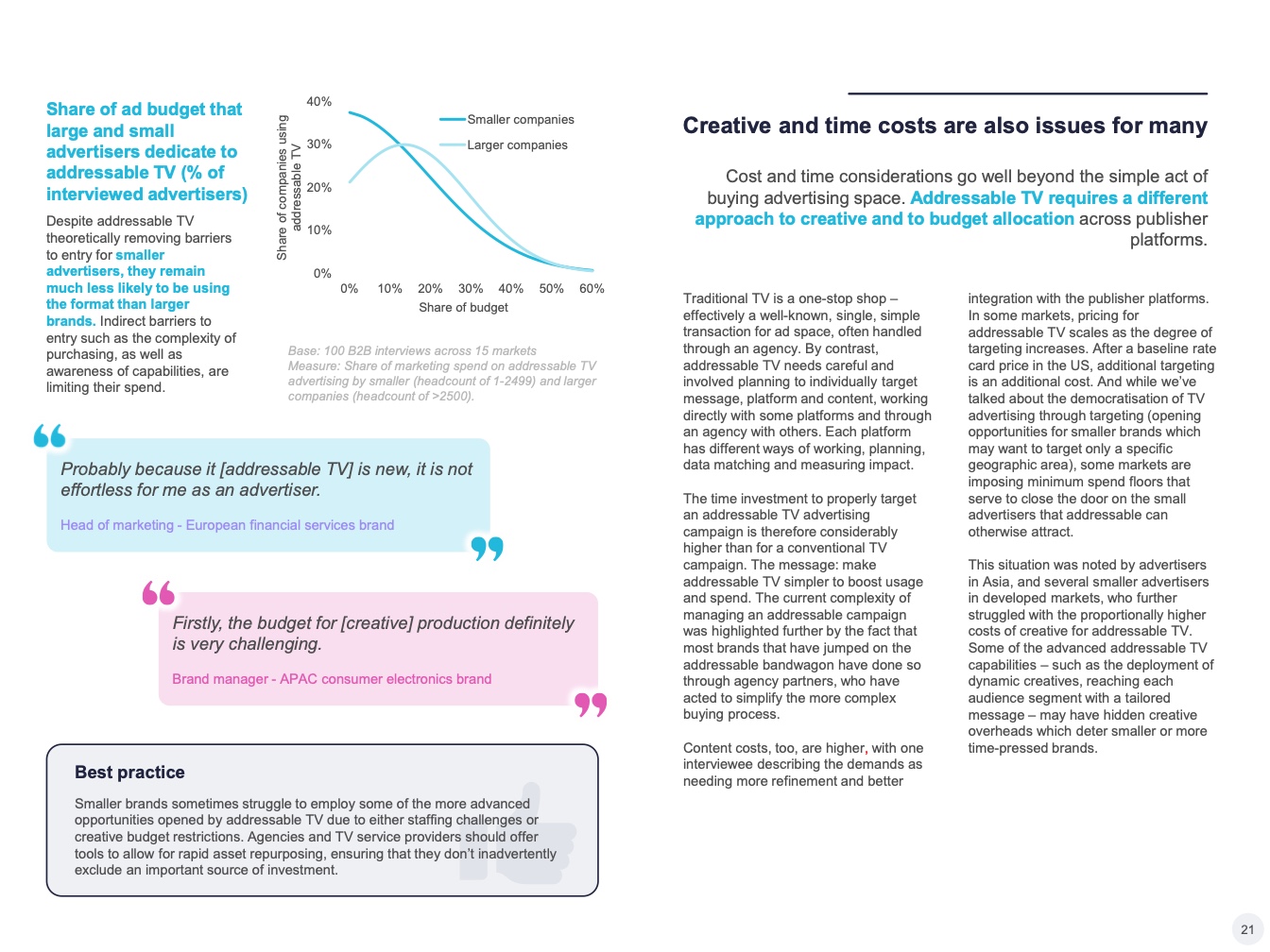 理论上讲,可寻址电视通过销售特定的受众群体,消除了小品牌的进入壁垒,但小型营销者仍不太可能使用可寻址电视。中小型公司通常对策划和执行寻址电视活动的时间成本非常敏感。针对不同用户群生成和调整创意的成本也是这些营销人员所关心的问题。对于服务提供商和代理公司而言,提供简化和减少非库存开销的解决方案对于确保更多小型广告主的购买非常重要。