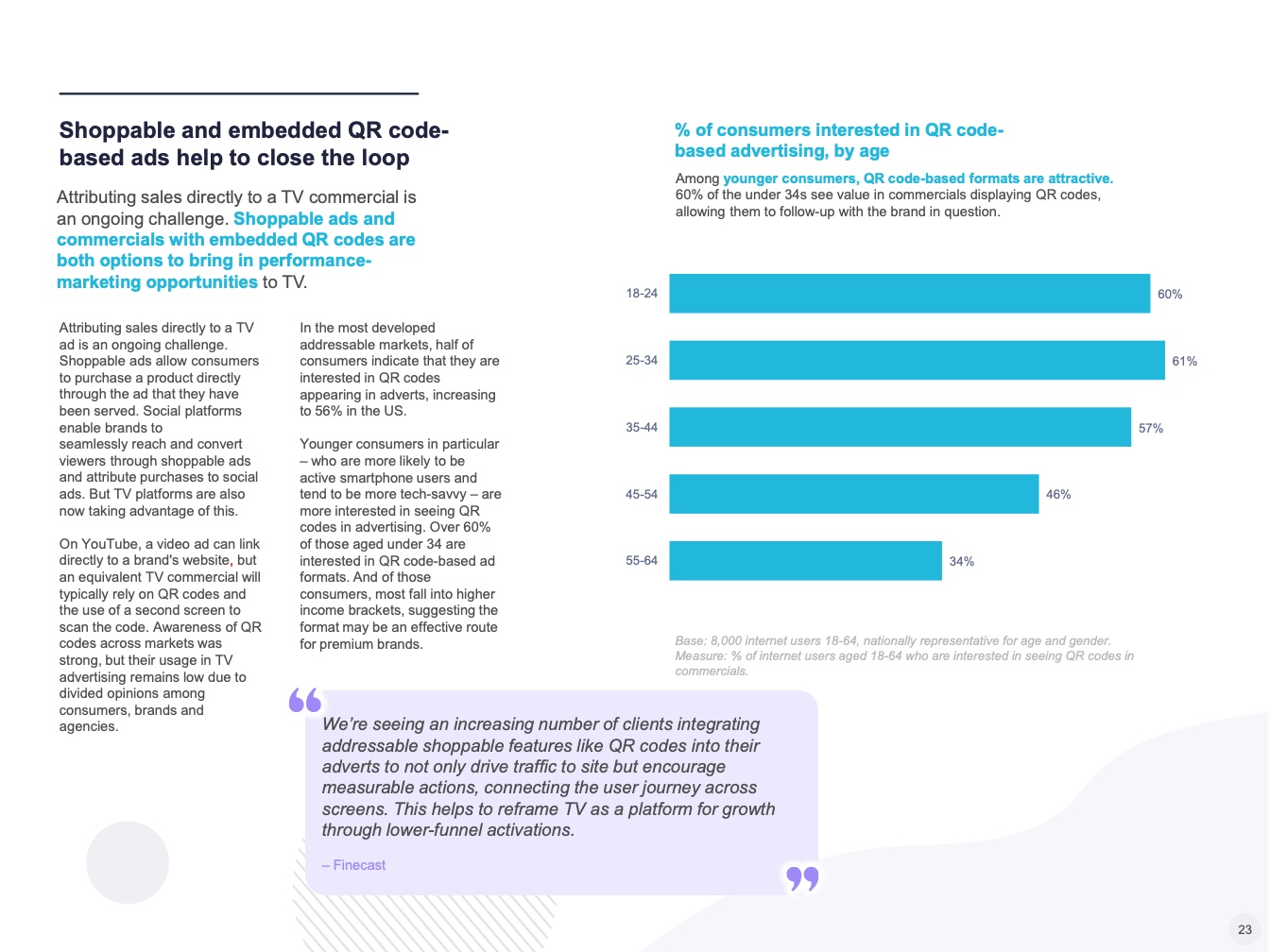 许多营销人员将可寻址电视视为向传统广播电视难以触达的用户群体提供高质量创意广告的关键。事实上,可寻址电视平台在年轻观众中提供了更大的覆盖范围。一些专注于这些群体的营销人员首先在可寻址电视服务上投入预算,其次才考虑广播电视等其他媒体。