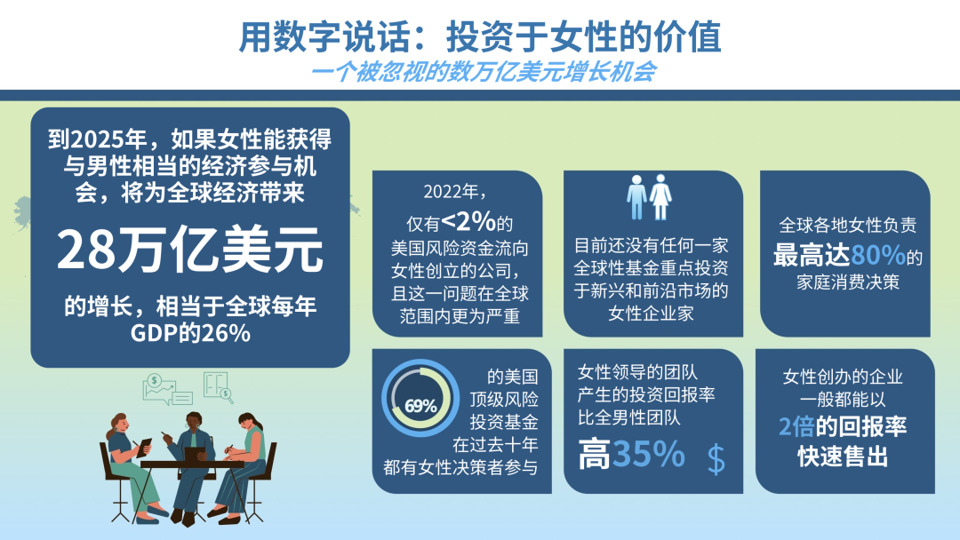 想象一个这样的世界,在那里,女性可以获得更多的资本来创造和扩大全球重大问题的解决方案;在那里,全球各地的女性能创立价值10亿美元的企业;在那里,我们可以用我们的力量,创造财富,为更美好的世界作出贡献。