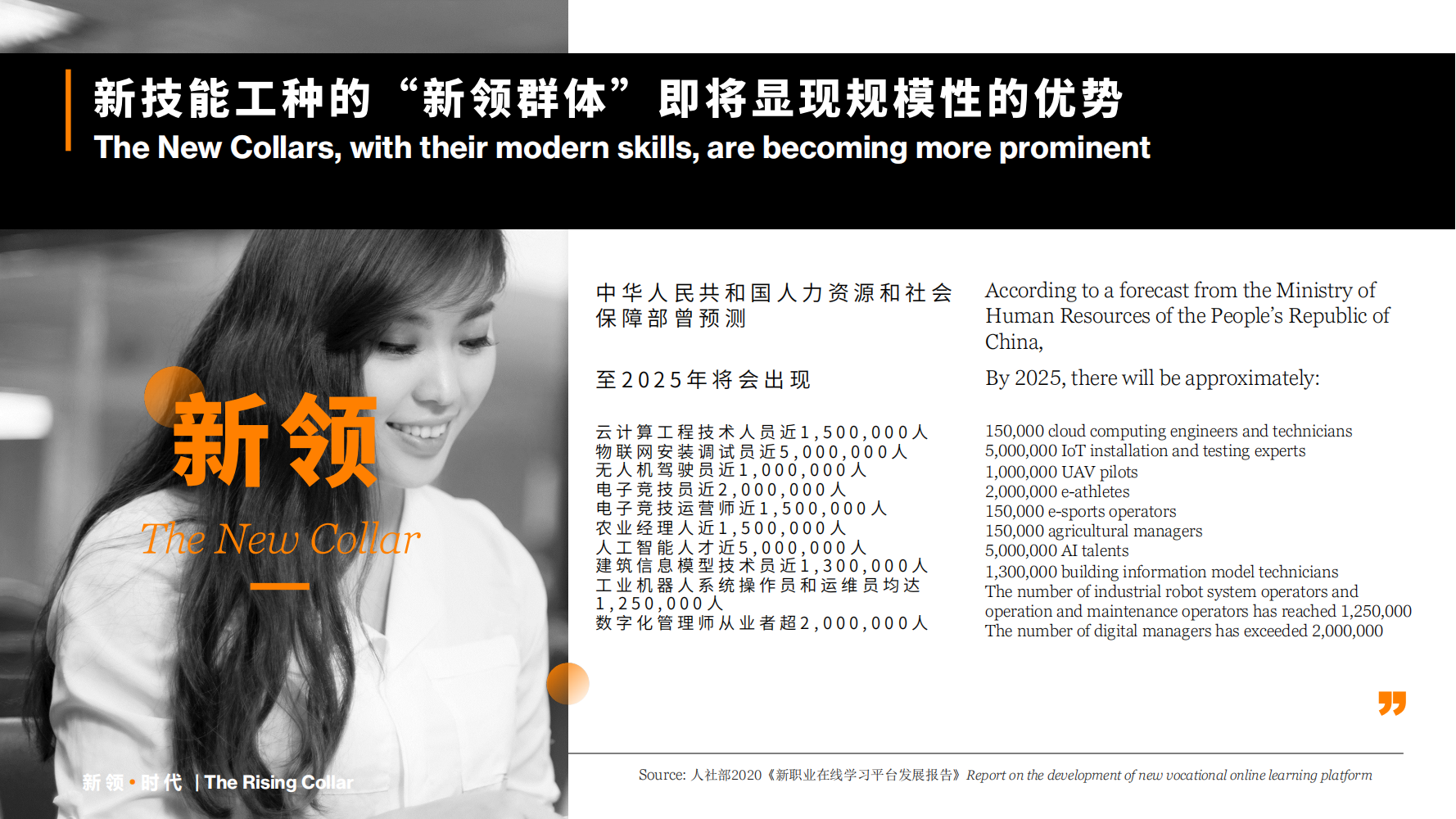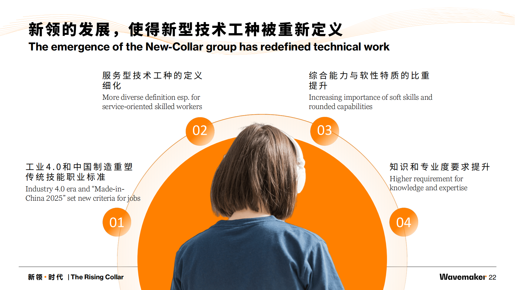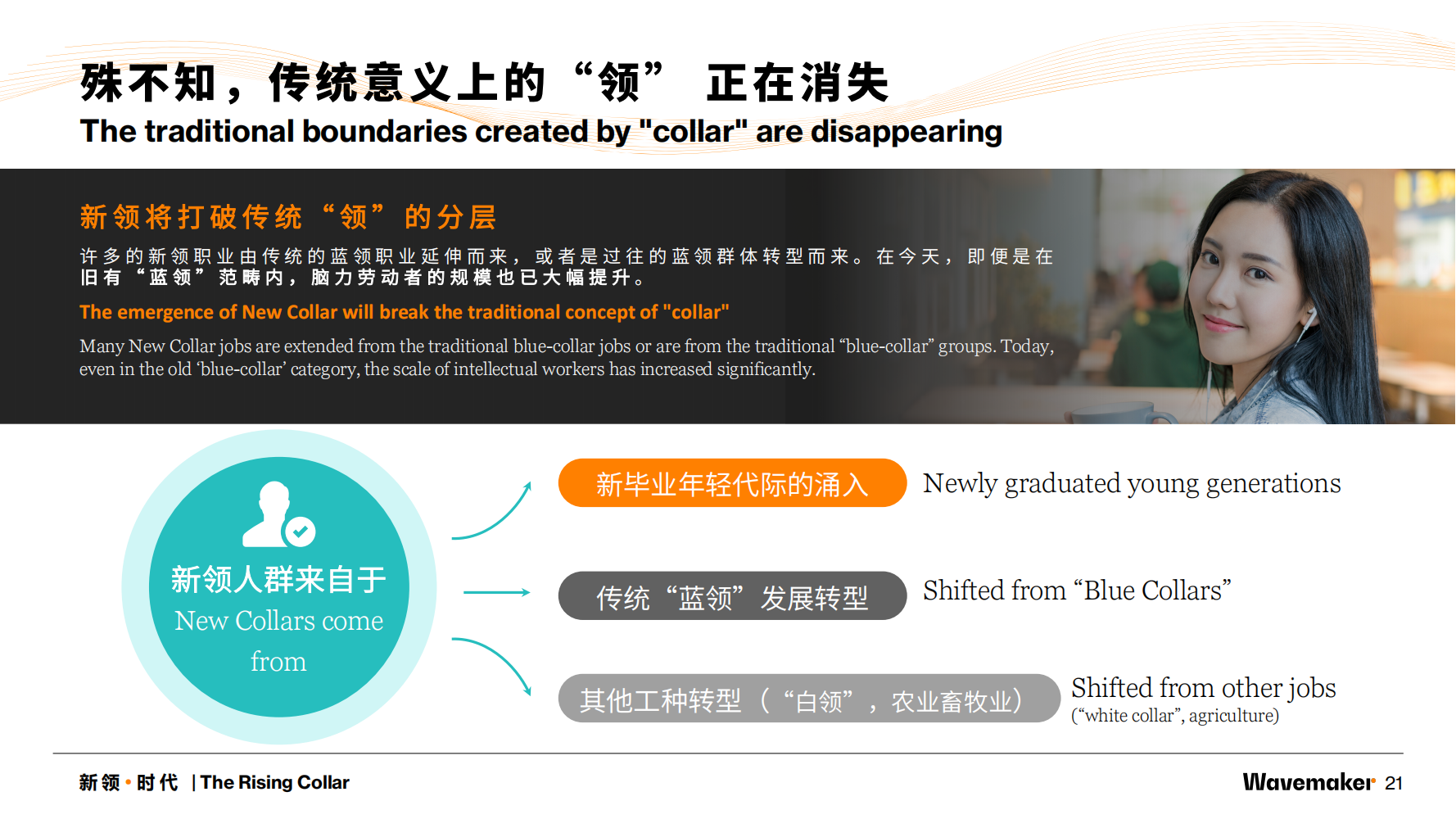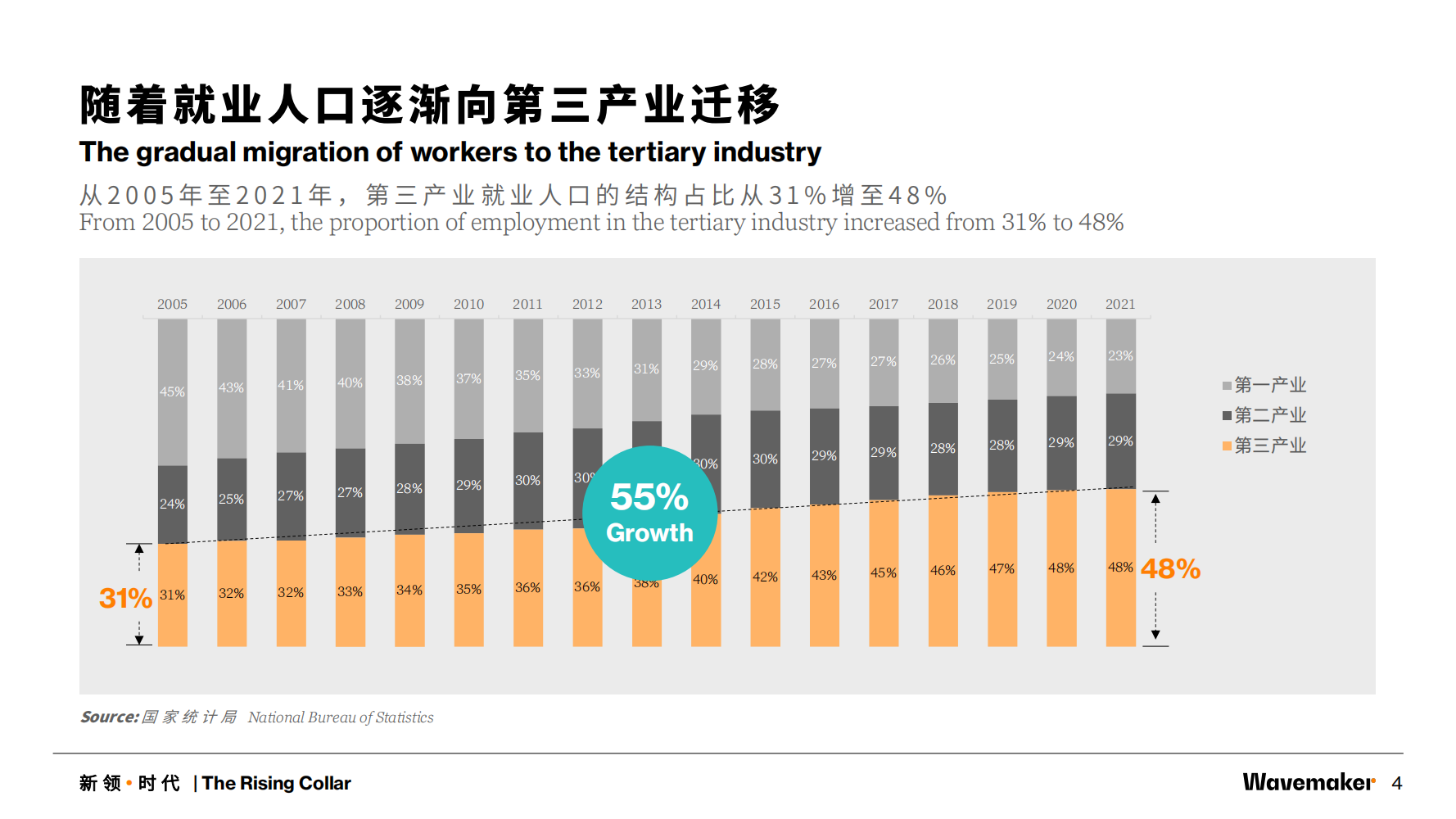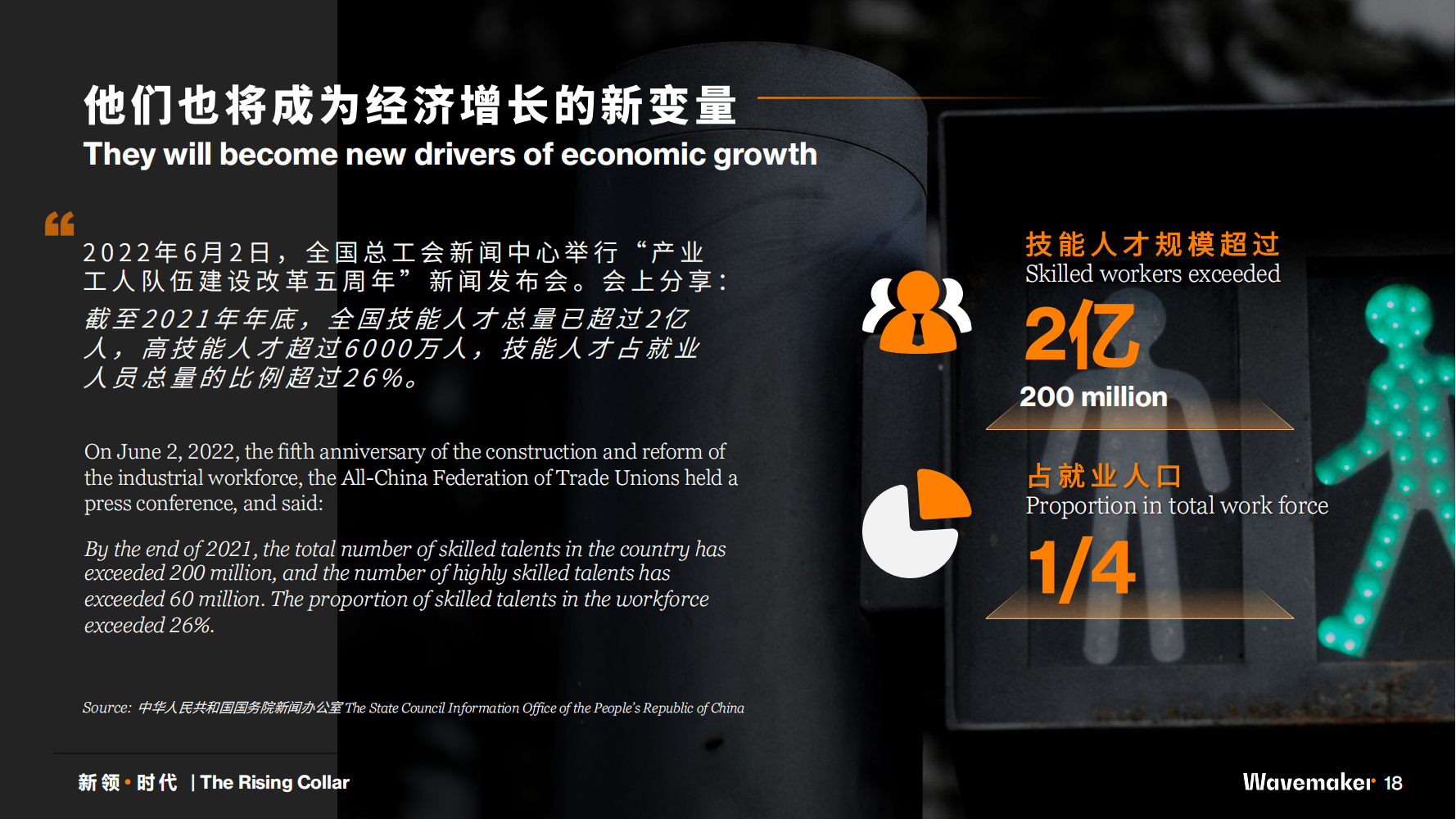 根据Wavemaker蔚迈《新领时代》报告(以下简称报告)所提供的数据,中国在 2005年至2021年间,第三产业的迁移呈55% 的增长,占就业结构的48%。而从事技能工种的人才,在2021年底也达到了总就业人口的1/4,超了2亿。人社部更预测,新技术工种的“新领”群体将在2025年达到百万级的规模。