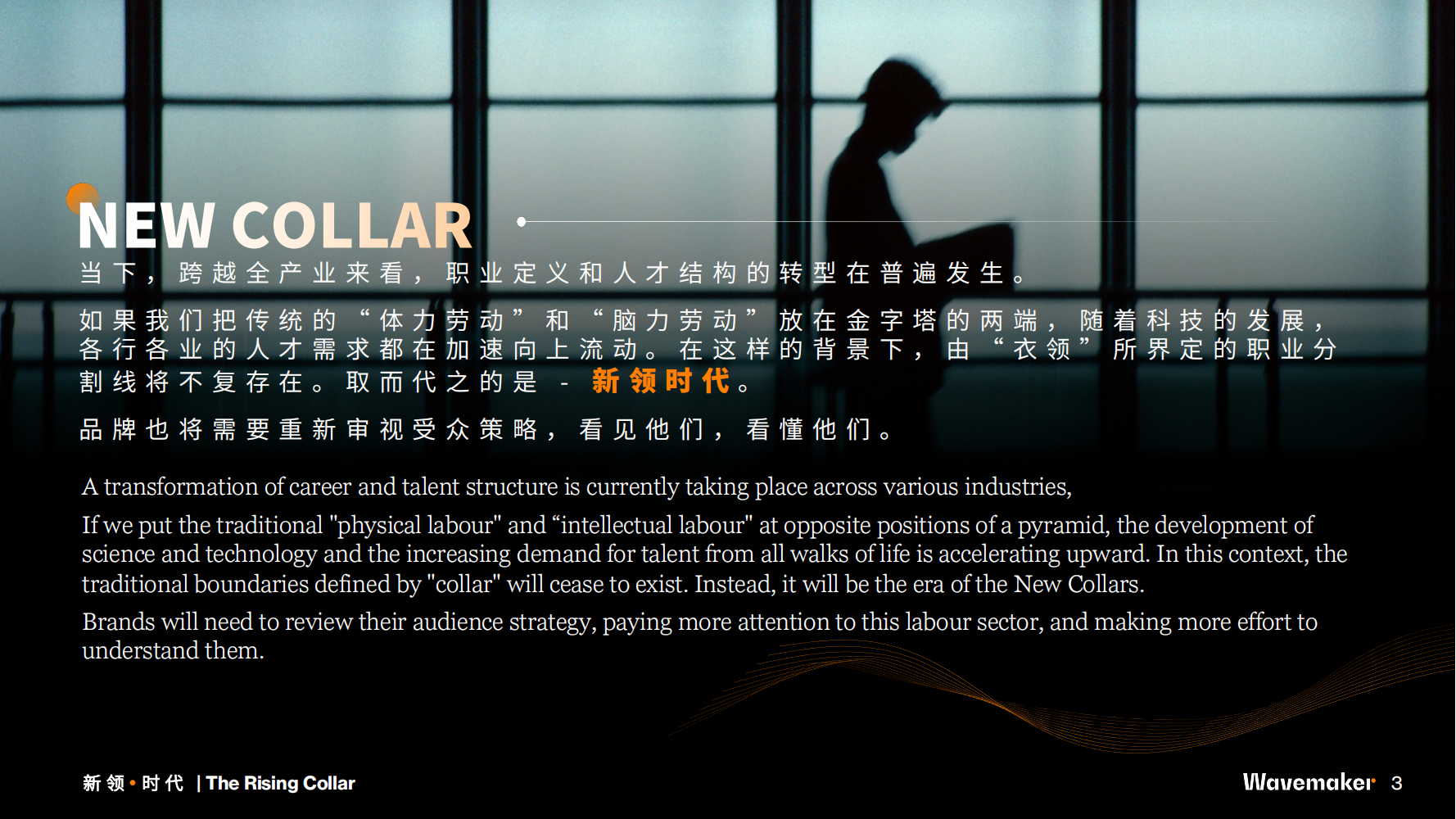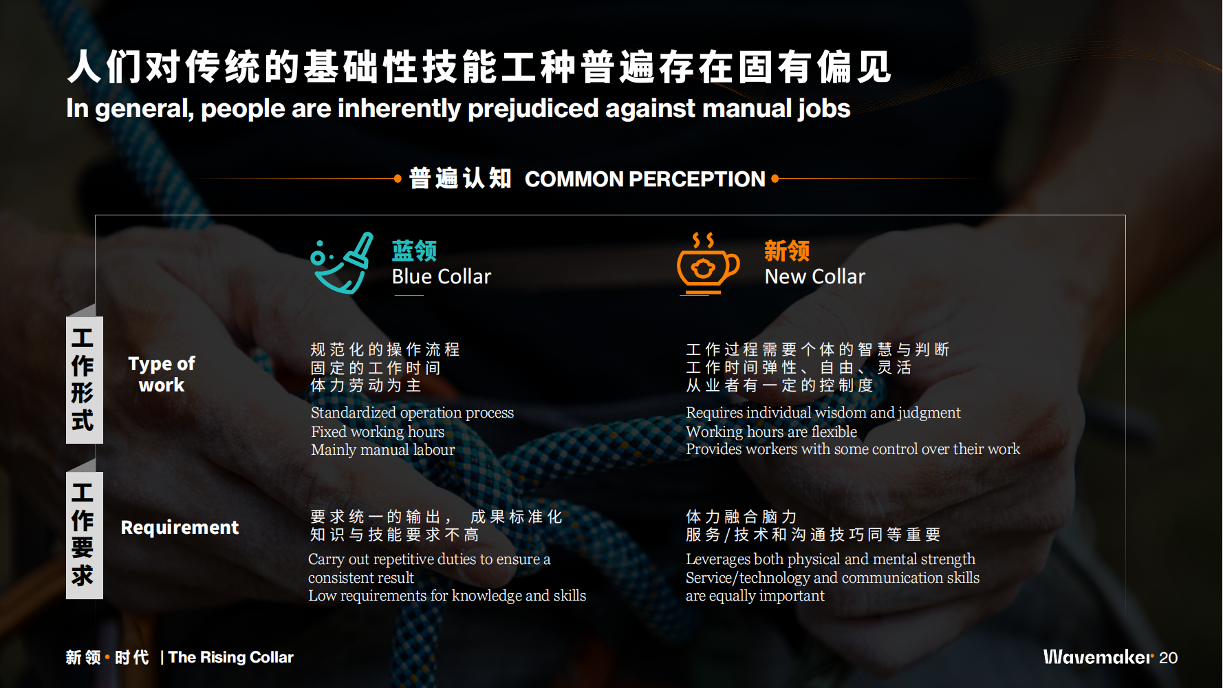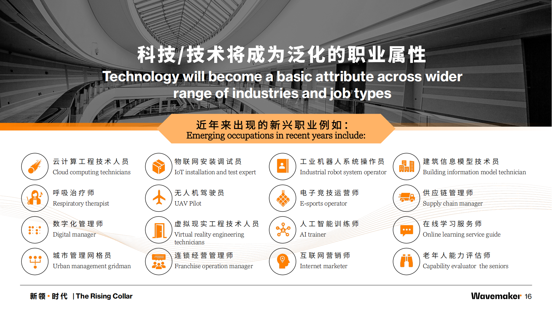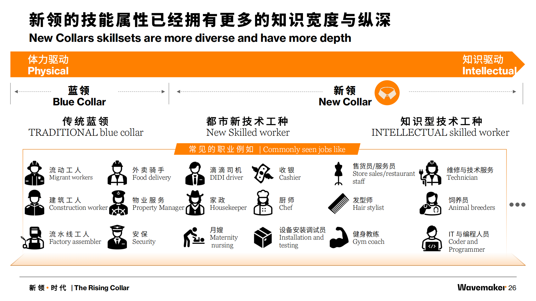 根据Wavemaker蔚迈《新领时代》报告(以下简称报告)所提供的数据,中国在 2005年至2021年间,第三产业的迁移呈55% 的增长,占就业结构的48%。而从事技能工种的人才,在2021年底也达到了总就业人口的1/4,超了2亿。人社部更预测,新技术工种的“新领”群体将在2025年达到百万级的规模。