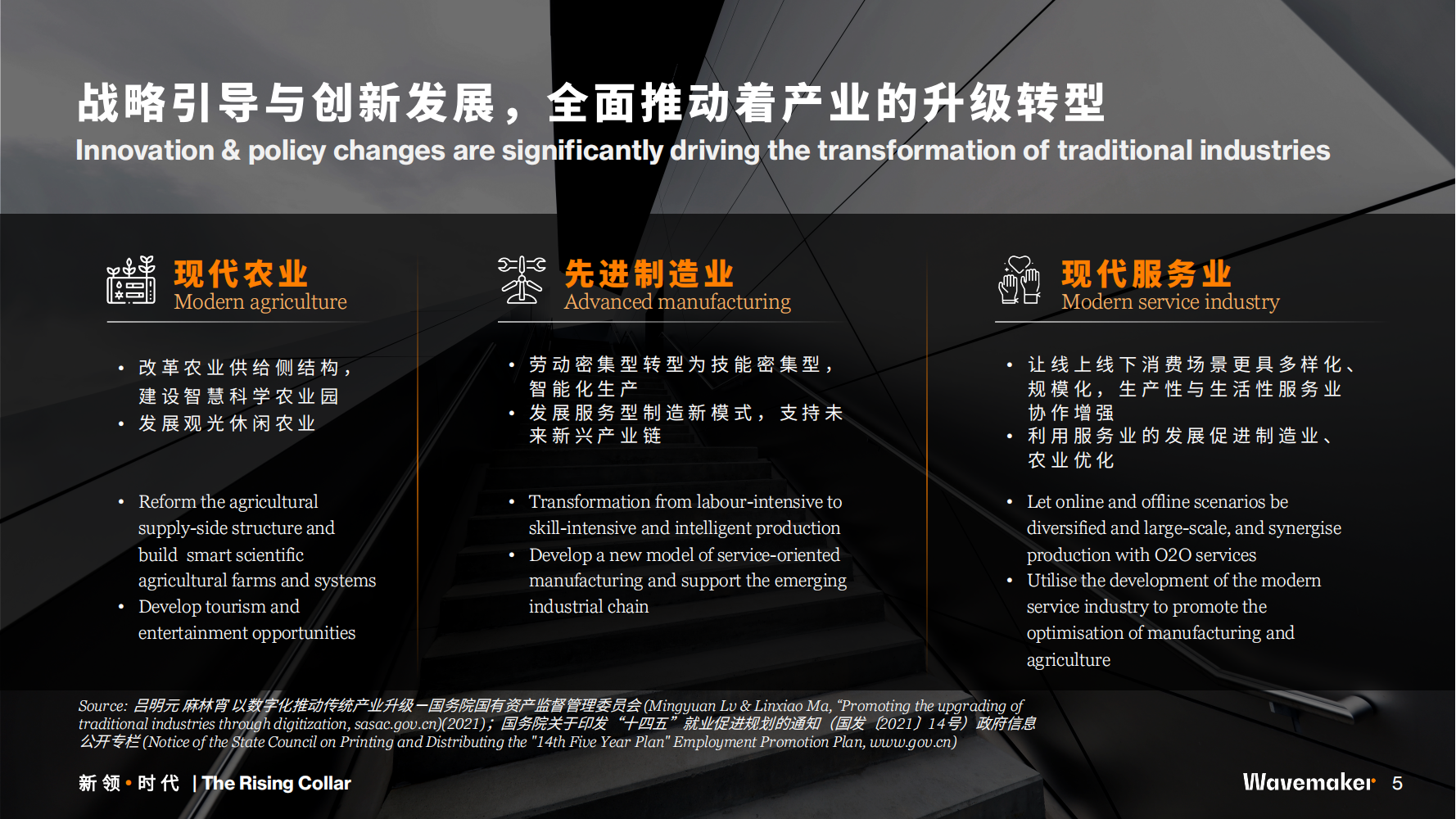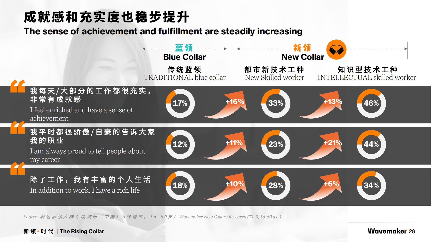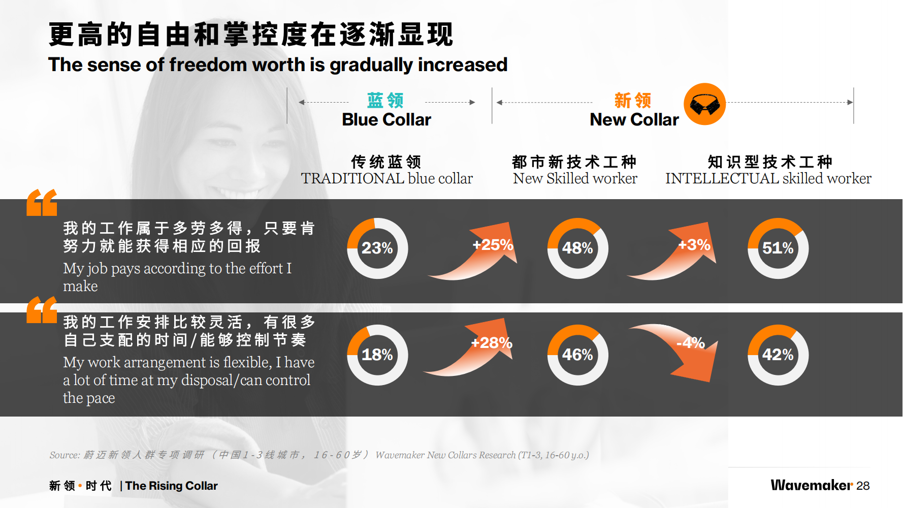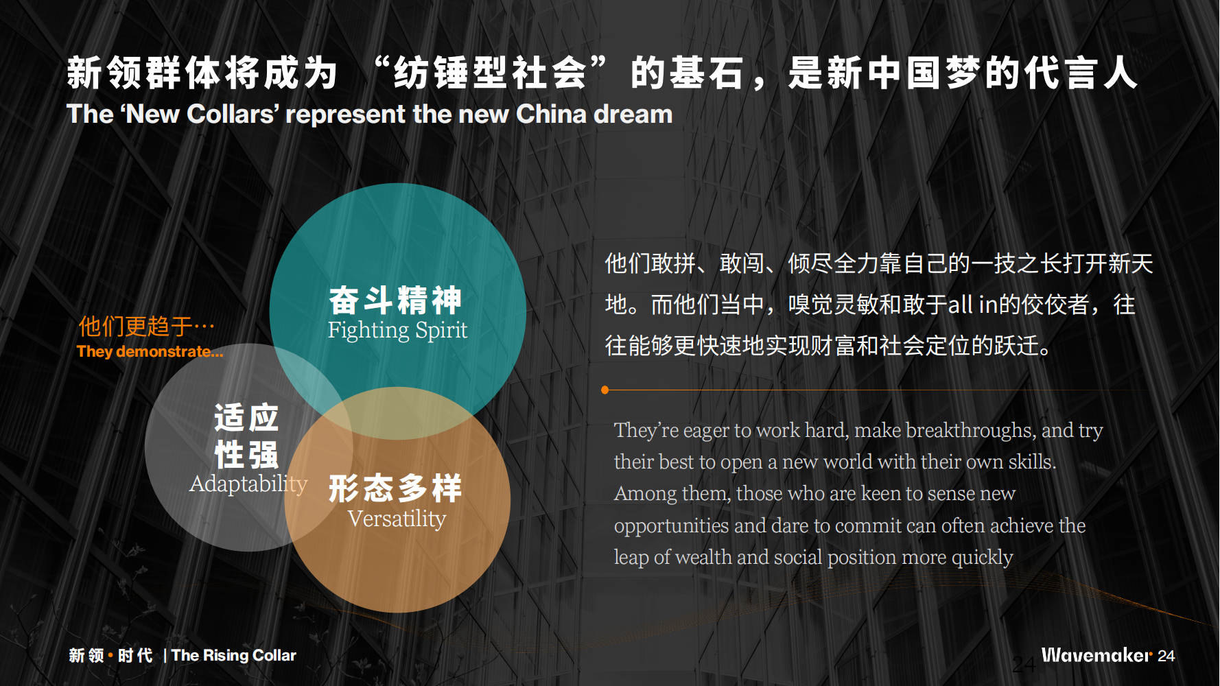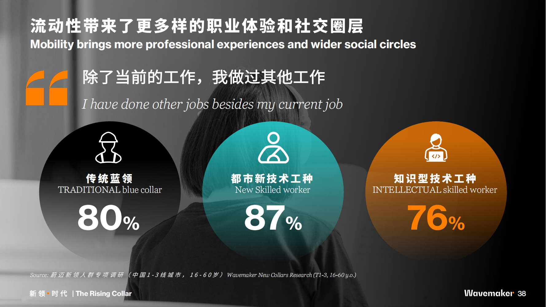 根据Wavemaker蔚迈《新领时代》报告(以下简称报告)所提供的数据,中国在 2005年至2021年间,第三产业的迁移呈55% 的增长,占就业结构的48%。而从事技能工种的人才,在2021年底也达到了总就业人口的1/4,超了2亿。人社部更预测,新技术工种的“新领”群体将在2025年达到百万级的规模。