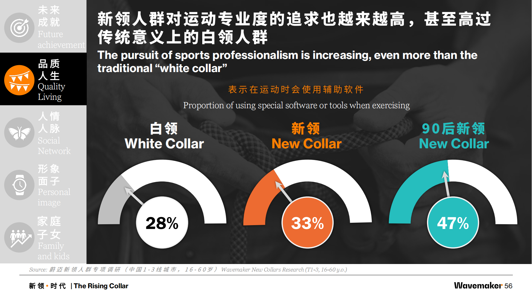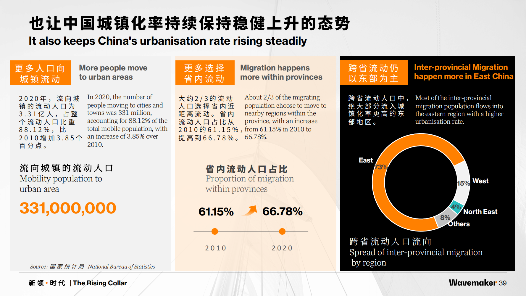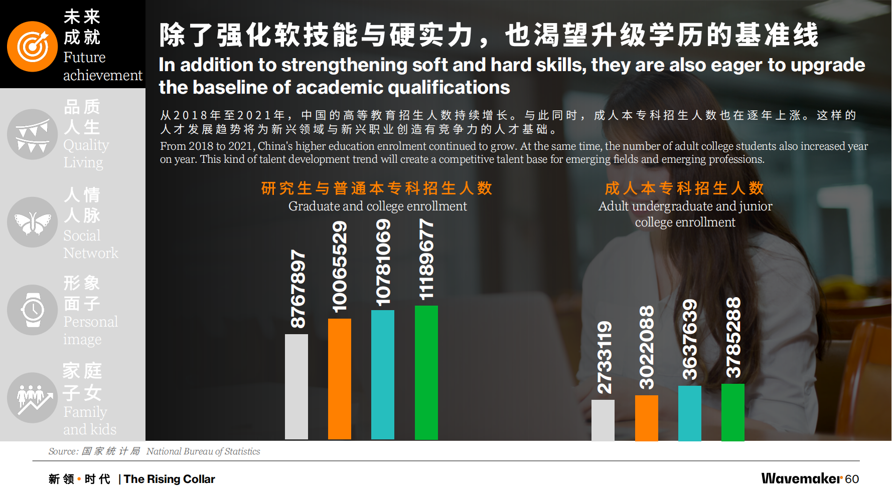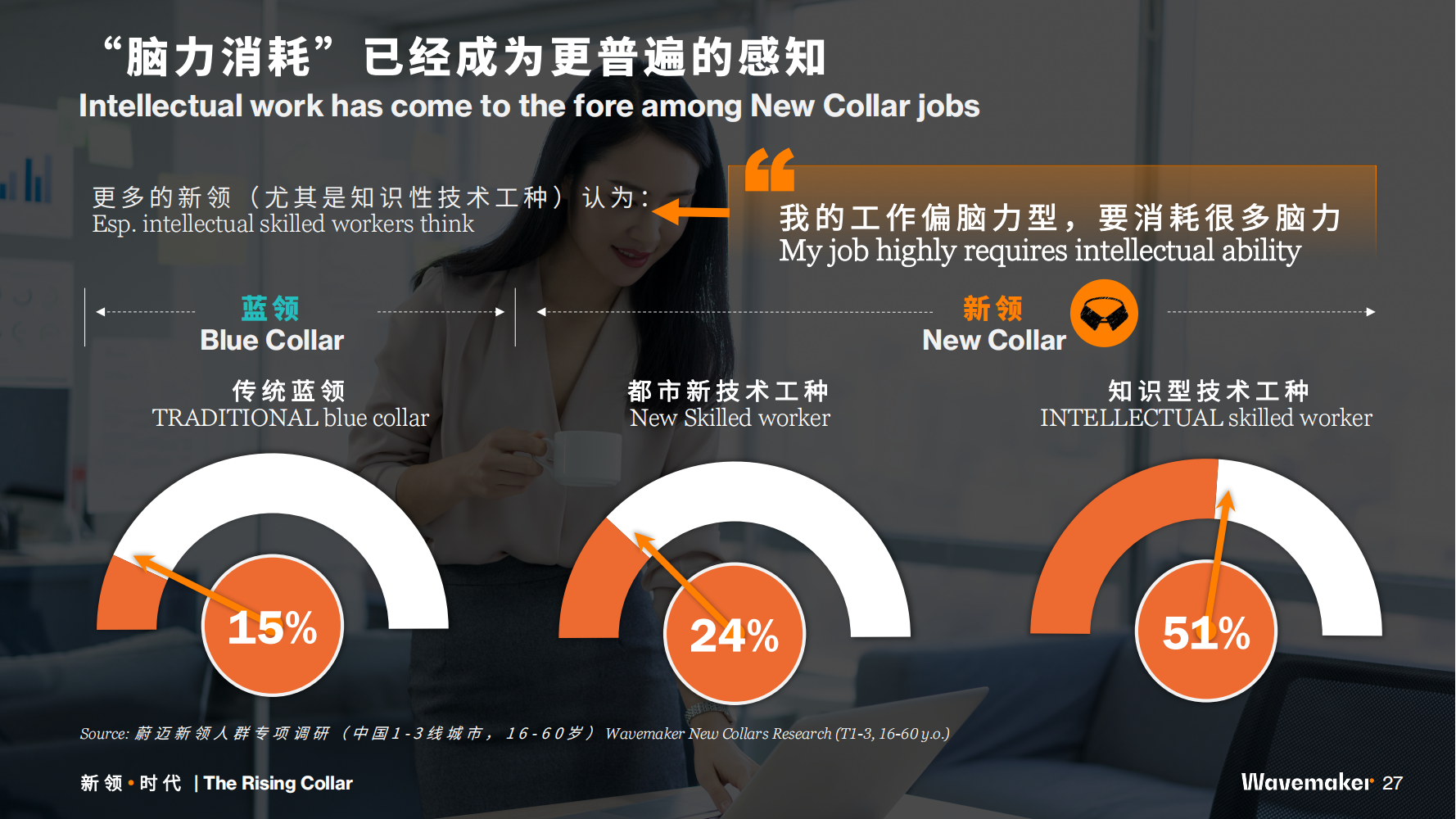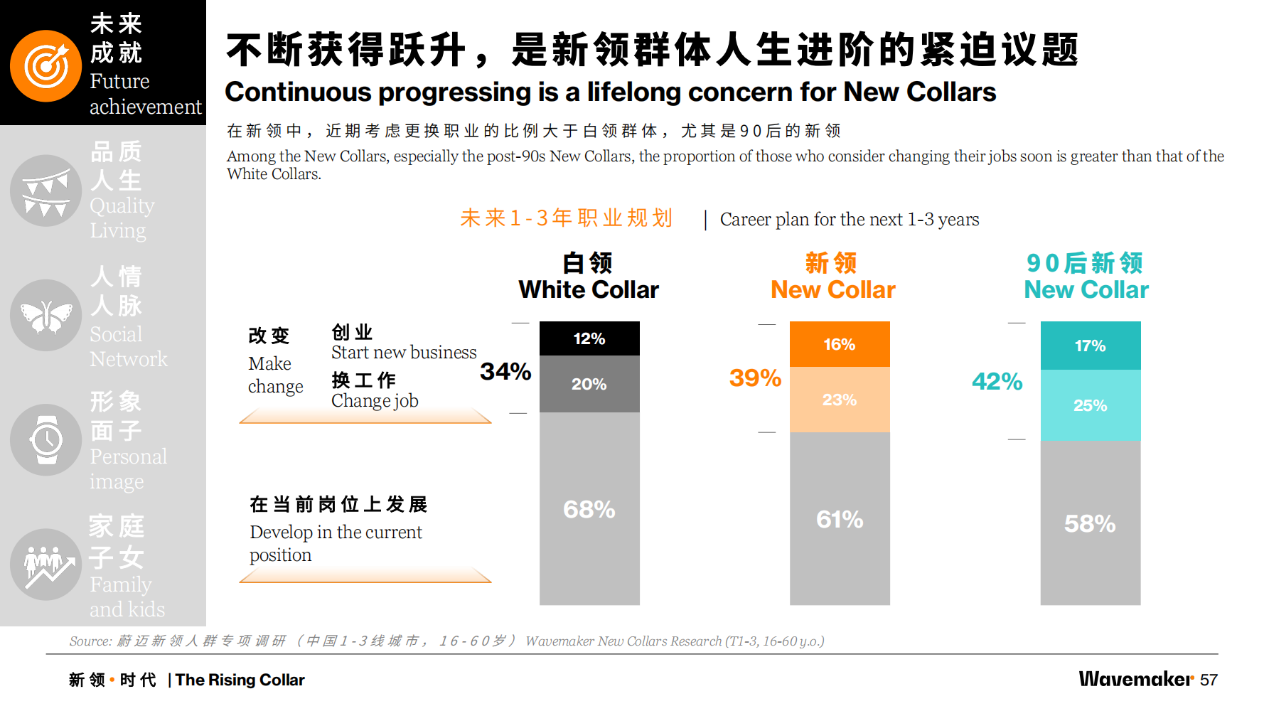 根据Wavemaker蔚迈《新领时代》报告(以下简称报告)所提供的数据,中国在 2005年至2021年间,第三产业的迁移呈55% 的增长,占就业结构的48%。而从事技能工种的人才,在2021年底也达到了总就业人口的1/4,超了2亿。人社部更预测,新技术工种的“新领”群体将在2025年达到百万级的规模。