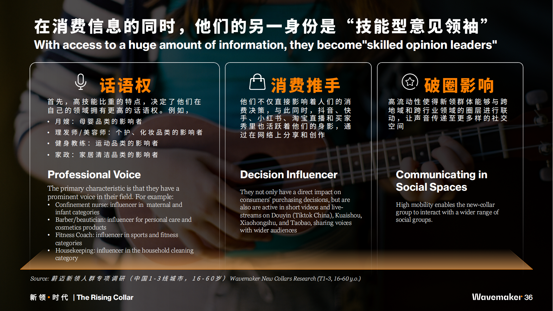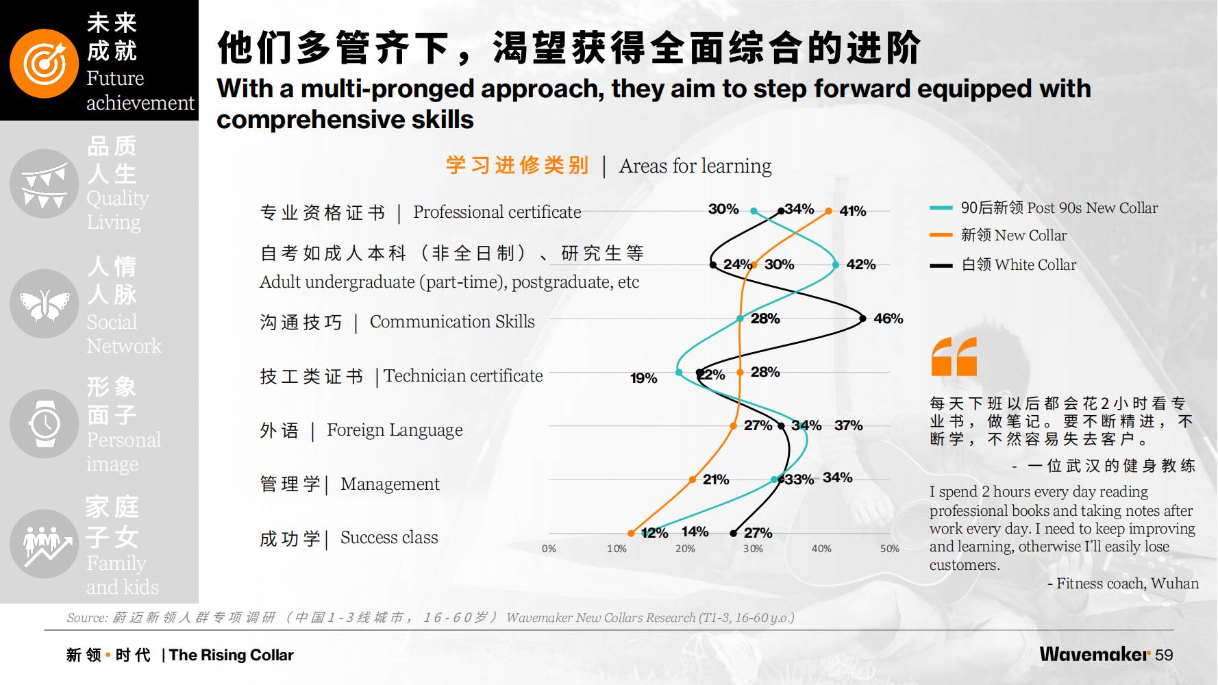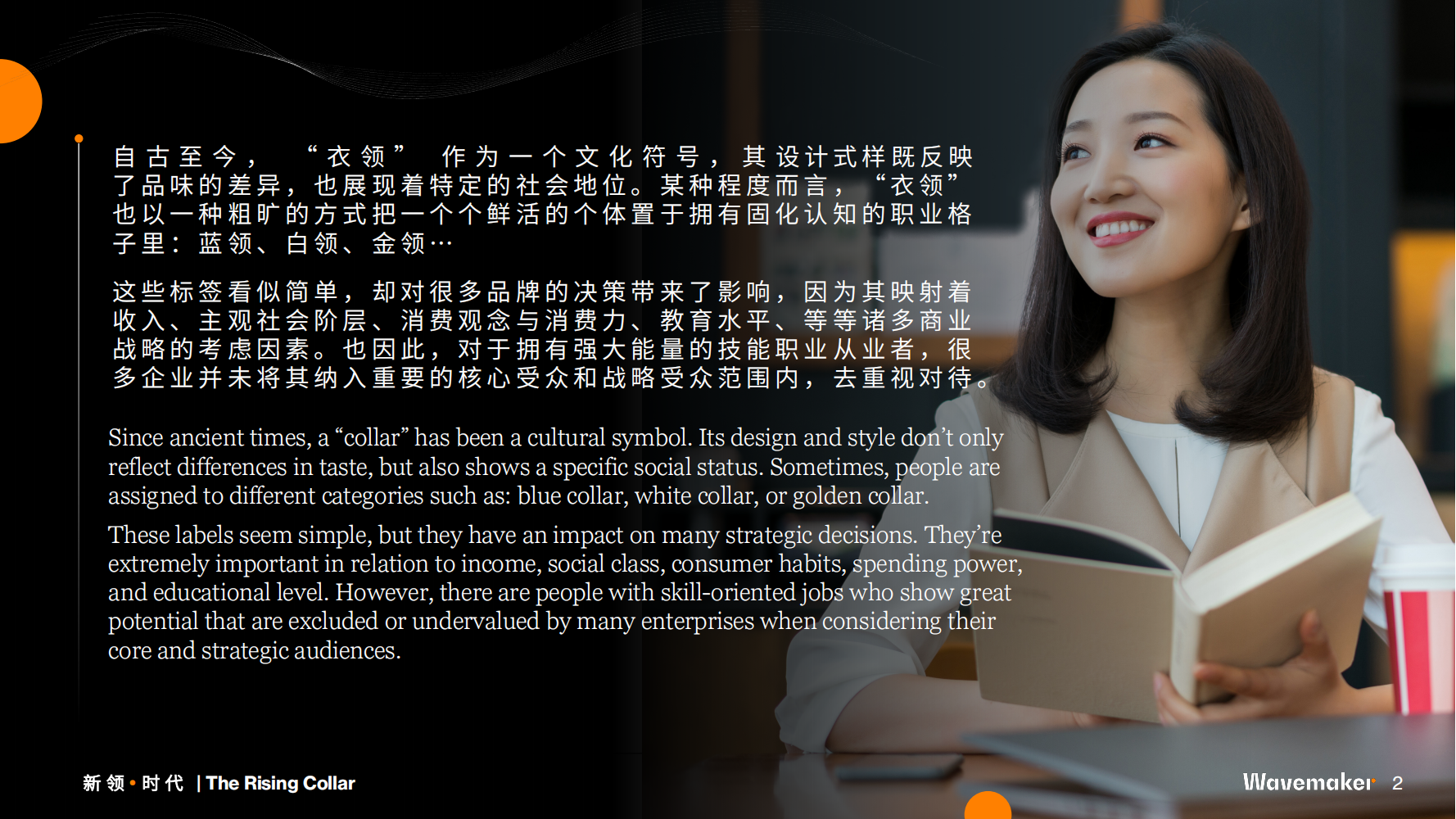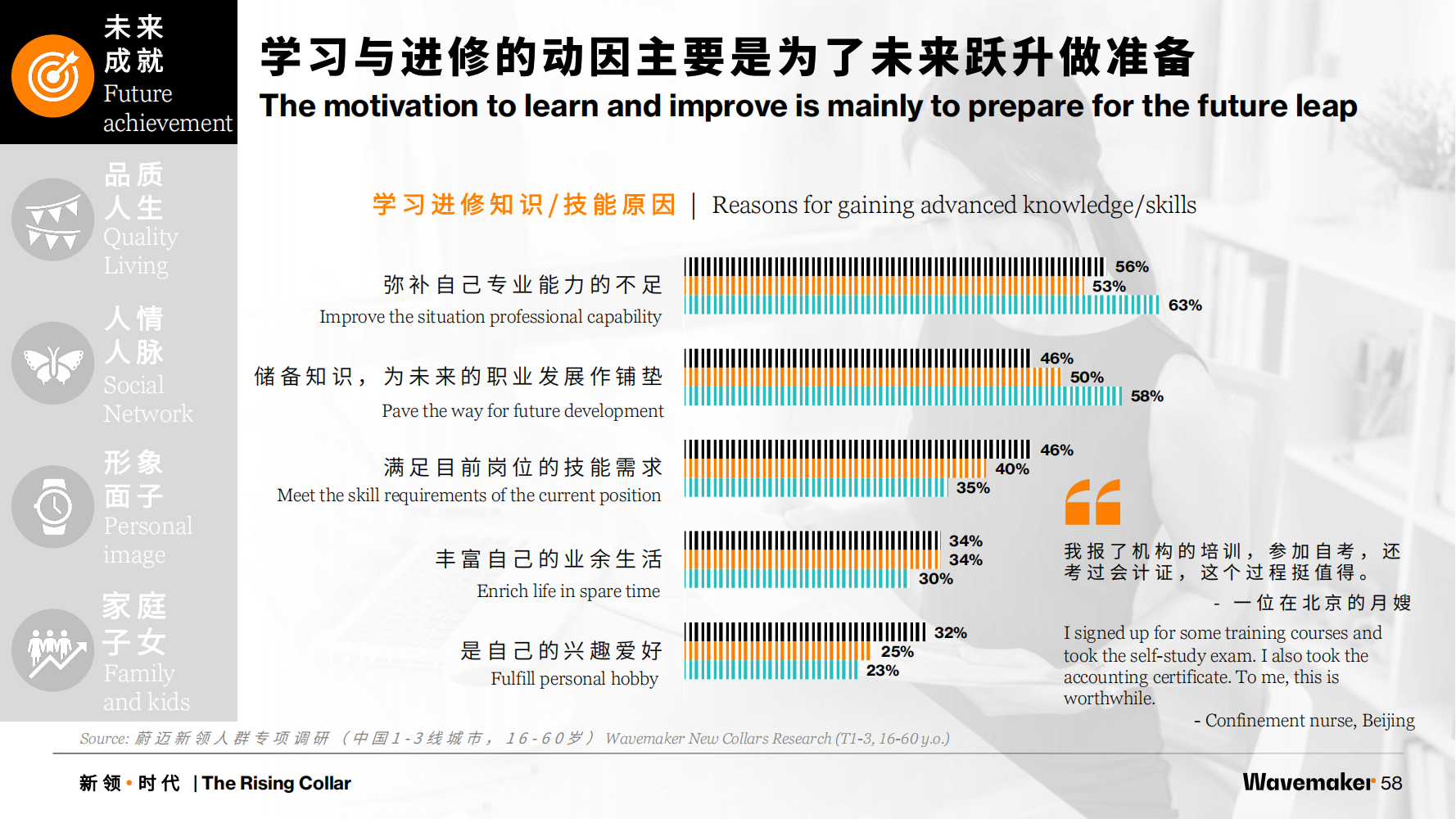 根据Wavemaker蔚迈《新领时代》报告(以下简称报告)所提供的数据,中国在 2005年至2021年间,第三产业的迁移呈55% 的增长,占就业结构的48%。而从事技能工种的人才,在2021年底也达到了总就业人口的1/4,超了2亿。人社部更预测,新技术工种的“新领”群体将在2025年达到百万级的规模。