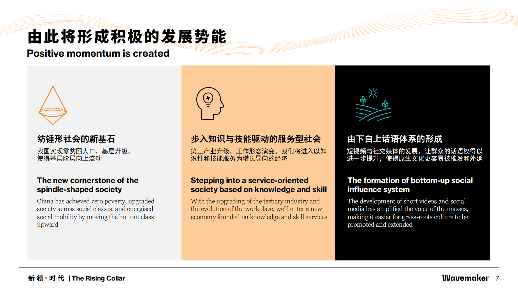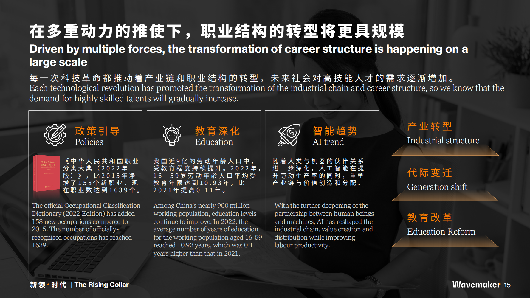 显而易见,中国正在进入一个以知识与技能驱动的服务型社会 ,而产业全面的升级转型,从政策引导、教育深化、智能价值的重塑,到代际变迁等多重动力所引发的职业结构的演变,也助长了新领群体的蓬勃发展,以及传统意义上“领”的消失 —— 在各方经济产业中急起直追的他们,将打破人们对固有“领”的认知,成为纺锤型社会的新基石,让“新领时代“写上历史的进程。