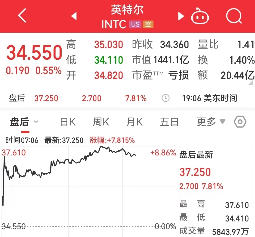 周四收盘,英特尔股价收报34.55美元,涨0.55%,总市值为1441.1亿美元。值得注意的是,财报发布后,英特尔股价盘后上涨近8%。
