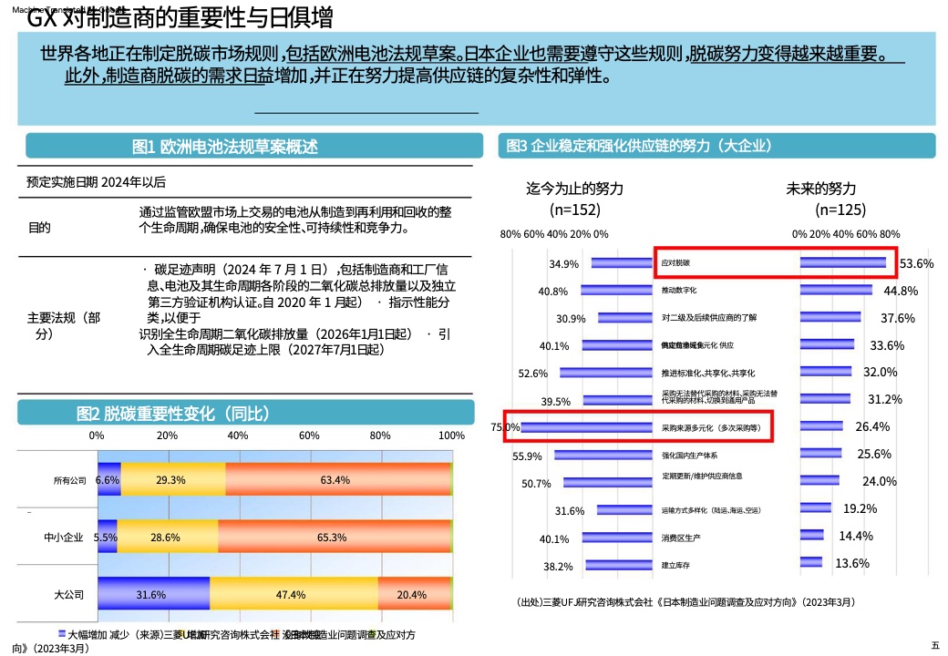 从日本2023年《制造业白皮书》中,我们看到了全球制造业发展的新趋势,即“在有效利用既有优势的同时,优化供应链,增强竞争力”“通过扩大对数字转型(DX)的投资和推动创新,提高生产率、增加利润,创造良性循环,对实现绿色转型(GX)至关重要”。白皮书强调,鉴于目前国际形势不稳、去碳化和劳动力短缺等因素带来的供应链中断风险加大,将加快基础技术和前沿技术的布局,并提出“增强供应链韧性来确保产能稳定”“实现全供应链的碳足迹可视化”“通过节省劳动力和自动化提高生产率和实现节能”“通过数字技术,实现全供应链的可视化和共同协作”等重要举措。上述举措是日本制造业的未来动向,但也具有一定代表性,数字化、脱碳、供应链安全等是今后全球制造业都将关注的问题。