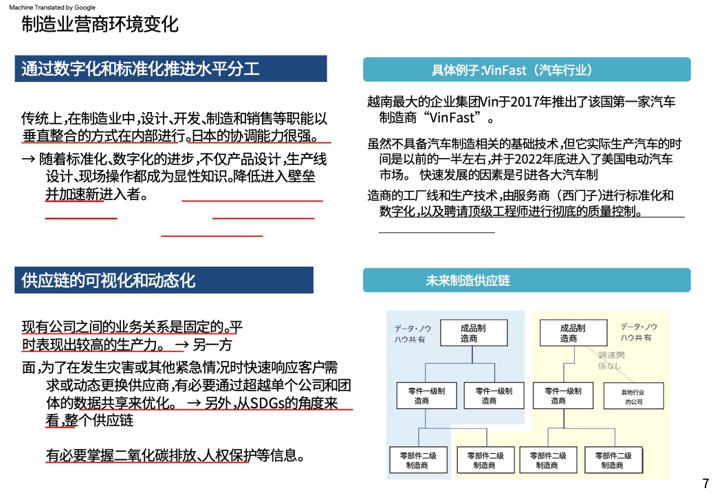 白皮书还强调,由于俄乌冲突,国际原材料和能源价格飙升、汇率波动等因素对2022年日本制造业企业的影响最大。鉴于目前国际形势不稳、去碳化和劳动力短缺等因素带来的制造业供应链中断风险加大,将加快基础技术和前沿技术的布局,并提出“增强供应链韧性来确保产能稳定”“实现全供应链的碳足迹可视化”“通过节省劳动力和自动化提高生产率和实现节能”“通过数字技术,实现全供应链的可视化和共同协作”“大力推动创新型人工智能、大数据、物联网、材料、光学/量子技术、环境能源等对未来社会至关重要的关键前沿技术的研发”等方面措施建议,从而提升日本制造业的竞争力。