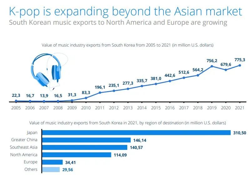 韩国流行音乐正在向亚洲以外的市场扩张。数据来源:Statista.com