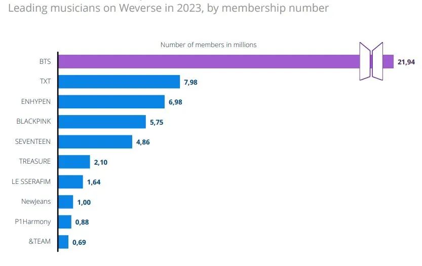 根据会员数量,Weverse上2023年的主要音乐家。数据来源:Statista.com