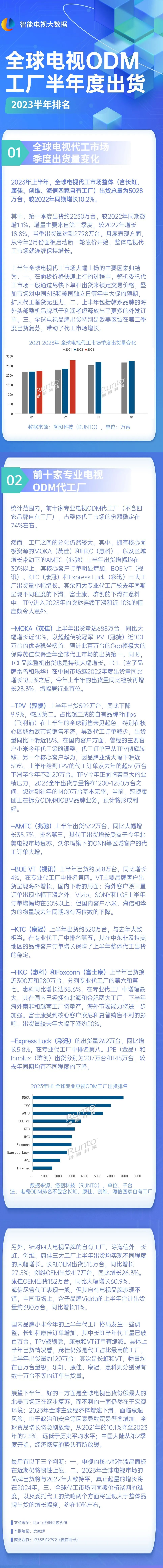2023半年全球电视ODM工厂出货量排名 更多阅读:Hub Entertainment:研究显示智能电视将成为家庭娱乐中心全球付费电视的收视率将上升,但收入将下降阿里影业财报:2023财年阿里影业营收人民币35.20亿元 盈利人民币2.95亿元报告:释放可寻址电视的潜力Omdia:2023年免费广告支持流媒体电视(FAST)频道产生63亿美元收入Hub:2023年美国联网家庭报告Omdia:线性电视收视率继续下降研究显示智能电视占OTT电视收视的一半NPD:研究显示SVoD 用户对价格更加敏感Hub Entertainment:研究显示观众随着他们的电视机发展而变化未来五年 SVOD 订阅量将增长 4.85 亿DTG:未来电视服务的重点BBC:汽车将成为电视消费未来的目的地Digital TV Research:预计2028年全球SVOD收入上升到124亿美元Digital TV Research:2027年西欧 SVOD 市场将增加 7300 万订阅用户